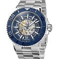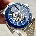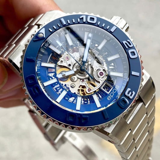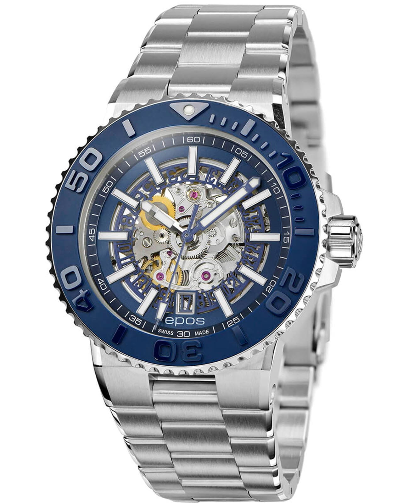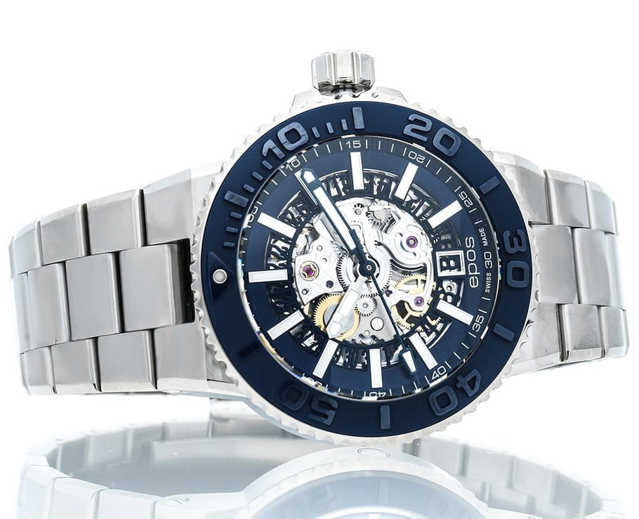 Мужские механические часы с автоподзаводом Epos из коллекции Sportive — это профессиональный дайверский инструмент с элементами скелетонизации и швейцарским качеством. Корпус диаметром 43 мм и толщиной 14 мм выполнен из нержавеющей стали 316L. Циферблат тёмно-синего цвета частично скелетонизирован, что открывает вид на сложную структуру механизма. Циферблат защищён сапфировым стекломСапфировое стеклоПрочный и надёжный материал из кристалла сапфира синтетического происхождения, характеризующийся особой твёрдостью и устойчивостью к царапинам и повреждениям.. Аппликации часовых индексов, крупные цифры и стрелки выполнены с покрытием. Стрелки и метки с люминесцентным покрытиемЛюминесцентное покрытиеПозволяет считывать показания времени в темноте. Производители наносят на стрелки, часовые индексы, безель или поверхность циферблата светонакопительный состав, дающий холодное свечение. Super-Luminova, обеспечивающим отличную читаемость в темноте. Механизм — швейцарский калибр Sellita SW200 с запасом хода 38 часов. Индикация даты реализована через скелетонизированный диск. БезельБезельВнешний ободок, закрепляющий стекло. В спортивных часах так называется поворотное кольцо с делениями на циферблате, выполняет роль таймера – замеряет отрезки времени на шкале. Неподвижный безель – элемент декора. Однонаправленно вращающийся безель на дайверских часах позволяет фиксировать моменты погружения и выныривания на поверхность. — однонаправленный вращающийся, с керамической накладкой глубокого синего цвета и рельефной шкалой погружений. Завинчивающаяся коронка и задняя крышка с прозрачным окном обеспечивают повышенную защиту и демонстрируют декор механизма. Автоматический гелиевый клапан позволяет использовать часы при профессиональном дайвинге. Часы оснащены стальным браслетом с литыми звеньями в 3 ряда и раскладной застёжкойРаскладная застёжкаТакой тип застёжки используется только на браслетах из металла. Она никогда не раскрывается полностью, происходит разделение на 2 и более частей. Раскладывающая застёжка снизит вероятность потери часов к минимуму. с двойной блокировкой и дополнительным фиксатором. Водонепроницаемость 500 м соответствует требованиям для глубоководных погружений. Гарантия — 24 месяца. Идеальный выбор для тех, кто ценит надёжность, техническое совершенство и экстремальные испытания.