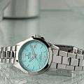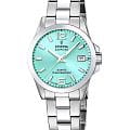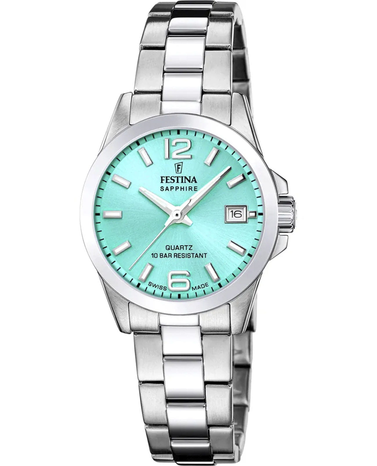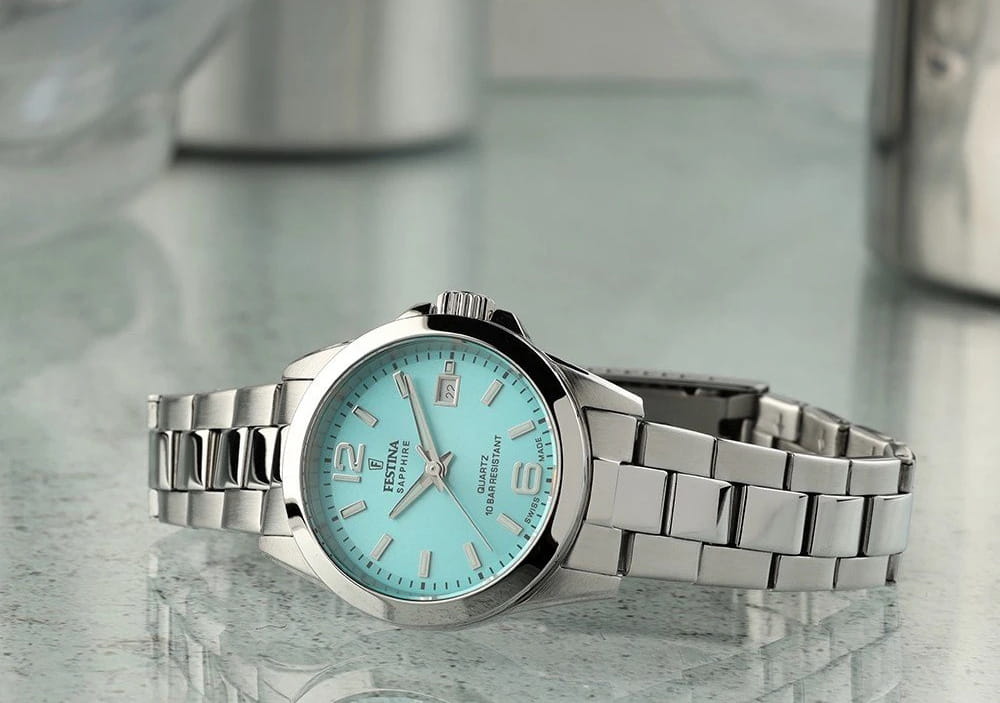 Женские кварцевые часы Festina F20049/4 из коллекции Swiss Made — это элегантный аксессуар, сочетающий швейцарское качество и классический стиль. Корпус диаметром 30 мм выполнен из нержавеющей стали серебряного цвета. Циферблат бирюзового цвета дополнен окошком даты в положении 3 часов. Циферблат защищён сапфировым стекломСапфировое стеклоПрочный и надёжный материал из кристалла сапфира синтетического происхождения, характеризующийся особой твёрдостью и устойчивостью к царапинам и повреждениям.. Стрелки и метки с люминесцентным покрытиемЛюминесцентное покрытиеПозволяет считывать показания времени в темноте. Производители наносят на стрелки, часовые индексы, безель или поверхность циферблата светонакопительный состав, дающий холодное свечение., обеспечивающим хорошую читаемость в темноте. Заводная головка — вытягивающегося типа, задняя крышка — завинчивающаяся, что обеспечивает повышенную надёжность. Часы оснащены стальным браслетом на раскладной застёжкеРаскладная застёжкаТакой тип застёжки используется только на браслетах из металла. Она никогда не раскрывается полностью, происходит разделение на 2 и более частей. Раскладывающая застёжка снизит вероятность потери часов к минимуму. с кнопками. Механизм — швейцарский кварцевый калибр Ronda 785 с 42-месячным сроком службы батареи. Водонепроницаемость 100 м позволяет использовать часы для плавания. Идеальный выбор для тех, кто ценит точность, стиль и швейцарское мастерство.