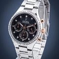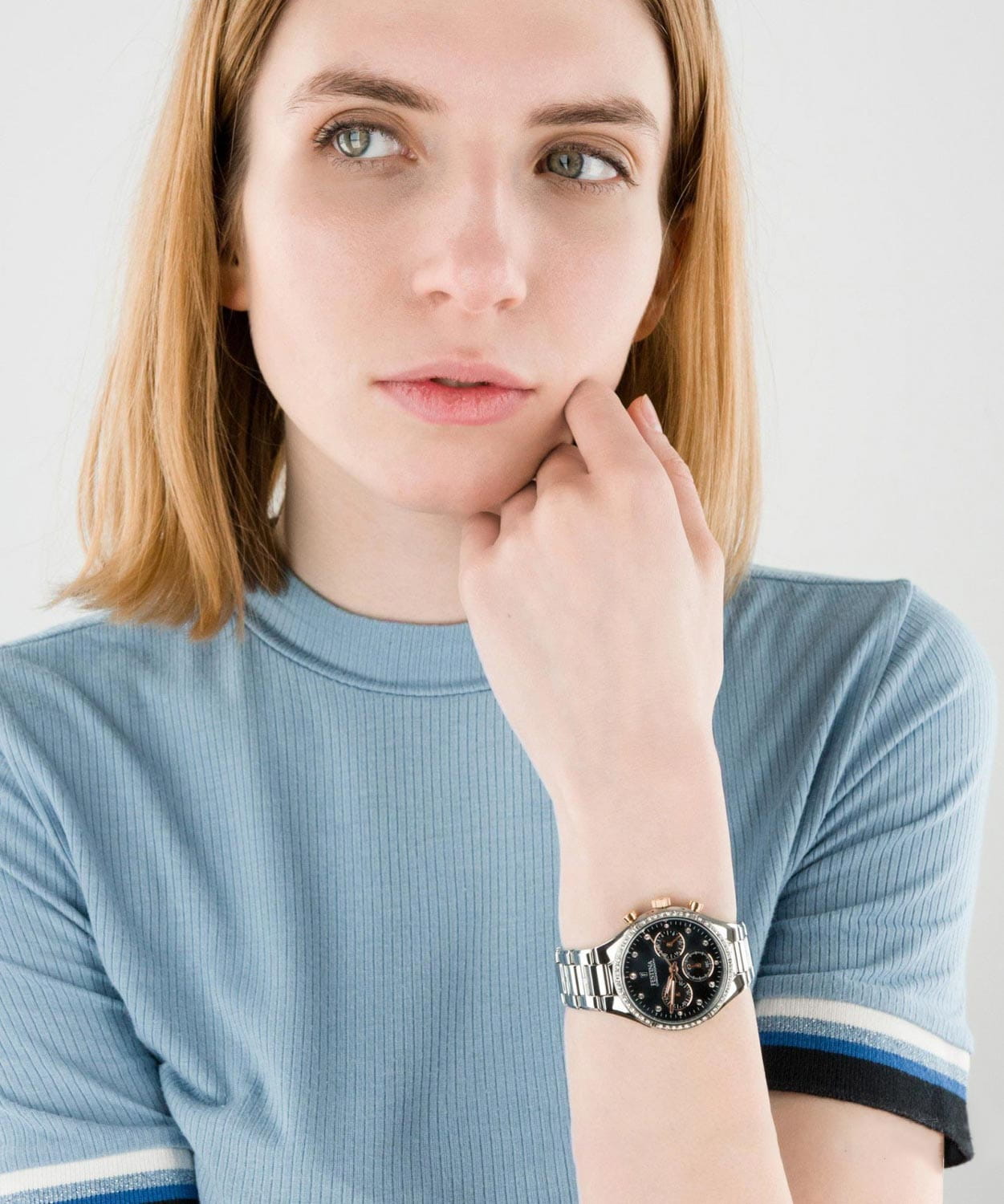 Яркий стиль и функциональность этих часов придутся по душе активной девушке. Кварцевый механизм с высокой точностью. Часы-хронографХронографФункция позволяет измерять отрезки времени с особой точностью: часы, минуты, секунды. Верным признаком хронографа является наличие на циферблате 3 дополнительных окошек-счётчиков. с минеральное стеклоМинеральное стеклоМинеральное стекло представляет собой искусственно выращенный минерал кварца. Такое стекло отличается особой устойчивостью к повреждениям и царапинам. Уступает по некоторым качествам сапфировому стеклу. устойчивое к появлению царапин, обладающее высокой прозрачностью. Стрелки с люминесцентным покрытиемЛюминесцентное покрытиеПозволяет считывать показания времени в темноте. Производители наносят на стрелки, часовые индексы, безель или поверхность циферблата светонакопительный состав, дающий холодное свечение.. Класс водозащиты: 50 метров, позволит защитить корпус от случайных брызг или капель дождя. Корпус часов изготовлен из нержавеющей стали. Браслет с раскладной застёжкойРаскладная застёжкаТакой тип застёжки используется только на браслетах из металла. Она никогда не раскрывается полностью, происходит разделение на 2 и более частей. Раскладывающая застёжка снизит вероятность потери часов к минимуму..