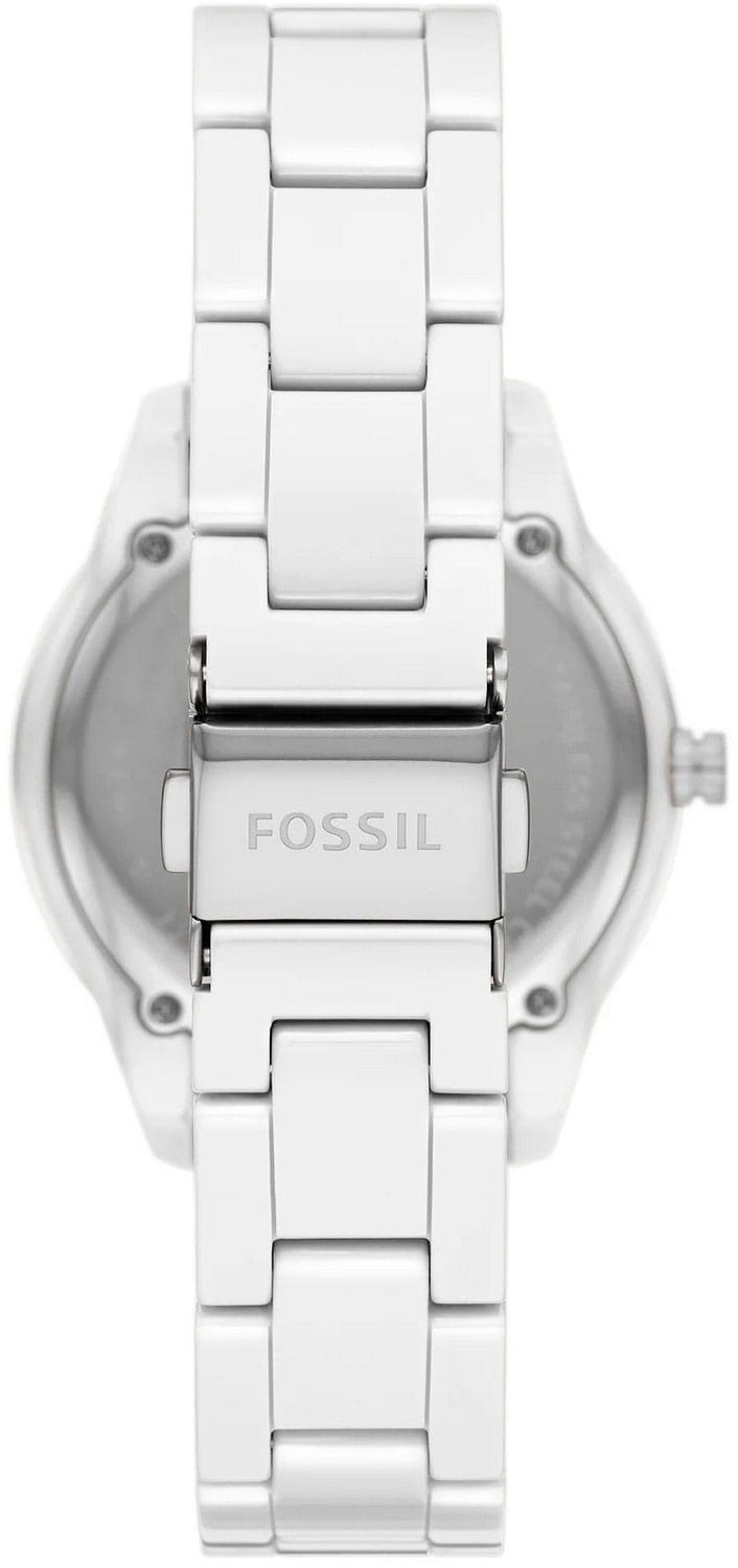 Женские наручные часы Fossil на браслете Fossil Stella CE1113, кварцевый механизм с высокой точностью. Класс водозащиты: 50 метров, позволит защитить корпус от случайных брызг или капель дождя. Стрелки с люминесцентным покрытиемЛюминесцентное покрытиеПозволяет считывать показания времени в темноте. Производители наносят на стрелки, часовые индексы, безель или поверхность циферблата светонакопительный состав, дающий холодное свечение.. БезельБезельВнешний ободок, закрепляющий стекло. В спортивных часах так называется поворотное кольцо с делениями на циферблате, выполняет роль таймера – замеряет отрезки времени на шкале. Неподвижный безель – элемент декора. Однонаправленно вращающийся безель на дайверских часах позволяет фиксировать моменты погружения и выныривания на поверхность. украшен кристаллами. Корпус часов изготовлен из стали. Керамический браслет с раскладной застёжкойРаскладная застёжкаТакой тип застёжки используется только на браслетах из металла. Она никогда не раскрывается полностью, происходит разделение на 2 и более частей. Раскладывающая застёжка снизит вероятность потери часов к минимуму..