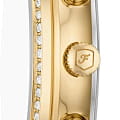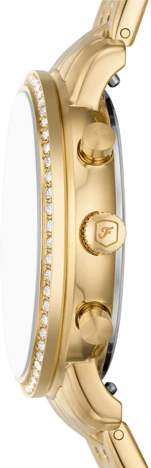 Fossil ES5358 – это изысканные женские часы-хронографХронографФункция позволяет измерять отрезки времени с особой точностью: часы, минуты, секунды. Верным признаком хронографа является наличие на циферблате 3 дополнительных окошек-счётчиков. с секундомеромСекундомерСекундоме́р — прибор, способный измерять интервалы времени с точностью до долей секунды., которые станут идеальным дополнением к вашему стилю, предлагая баланс между функциональностью и эстетикой. Эти часы изготовлены в США и оснащены надежным кварцевым механизмом, что обеспечивает точность и долговечность. Корпус часов выполнен из прочной стали с золотистым IP-покрытиемIP-покрытиеМетод ионного напыления. Демонстрирует повышенную устойчивость к истиранию, окислению и химическим веществам. Под воздействием высокого давления и температуры около 1500°C молекулы металла надёжно соединяются с частицами корпуса часов., а безельБезельВнешний ободок, закрепляющий стекло. В спортивных часах так называется поворотное кольцо с делениями на циферблате, выполняет роль таймера – замеряет отрезки времени на шкале. Неподвижный безель – элемент декора. Однонаправленно вращающийся безель на дайверских часах позволяет фиксировать моменты погружения и выныривания на поверхность. дополнен кристаллами, добавляя блеска и шарма. Белый перламутровый циферблат гармонично сочетается с маркировкой в виде штрихов и римскими цифрами VI и XII, придавая часам классический вид. Окошко даты, расположенное между отметками 4 и 5 часов, добавляет удобства в повседневном использовании. Часы обладают водозащитой 50WR, что позволяет не беспокоиться о случайных попаданиях влаги. Минеральное стеклоМинеральное стеклоМинеральное стекло представляет собой искусственно выращенный минерал кварца. Такое стекло отличается особой устойчивостью к повреждениям и царапинам. Уступает по некоторым качествам сапфировому стеклу. защищает циферблат от царапин и повреждений. Стрелки с люминесцентным покрытиемЛюминесцентное покрытиеПозволяет считывать показания времени в темноте. Производители наносят на стрелки, часовые индексы, безель или поверхность циферблата светонакопительный состав, дающий холодное свечение. позволяют легко считывать время даже в условиях низкой освещенности. Стальной браслет с золотистым IP-покрытиемIP-покрытиеМетод ионного напыления. Демонстрирует повышенную устойчивость к истиранию, окислению и химическим веществам. Под воздействием высокого давления и температуры около 1500°C молекулы металла надёжно соединяются с частицами корпуса часов. и  раскладной застёжкойРаскладная застёжкаТакой тип застёжки используется только на браслетах из металла. Она никогда не раскрывается полностью, происходит разделение на 2 и более частей. Раскладывающая застёжка снизит вероятность потери часов к минимуму. обеспечивает комфортное ношение и надежную фиксацию на запястье, с габаритными размерами 36 мм в диаметре, шириной браслета 16 мм и длиной 175 мм. Эти часы — прекрасный выбор для тех, кто ценит стиль и качество в каждом элементе аксессуара.