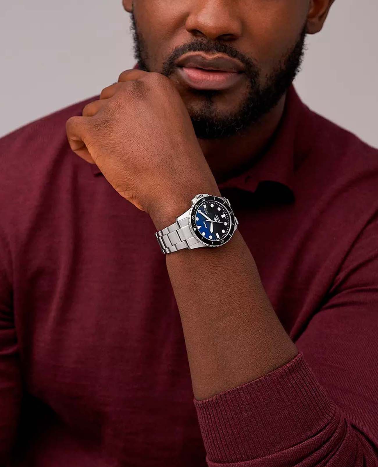 Мужские наручные часы с надёжным кварцевым механизмом Fossil Blue FS6038. Корпус и браслет часов изготовлены из нержавеющей стали. Вращающийся безельБезельВнешний ободок, закрепляющий стекло. В спортивных часах так называется поворотное кольцо с делениями на циферблате, выполняет роль таймера – замеряет отрезки времени на шкале. Неподвижный безель – элемент декора. Однонаправленно вращающийся безель на дайверских часах позволяет фиксировать моменты погружения и выныривания на поверхность. с IP-покрытиемIP-покрытиеМетод ионного напыления. Демонстрирует повышенную устойчивость к истиранию, окислению и химическим веществам. Под воздействием высокого давления и температуры около 1500°C молекулы металла надёжно соединяются с частицами корпуса часов.. Окошко даты находится в положении 3 часа. Стрелки и метки с люминесцентным покрытиемЛюминесцентное покрытиеПозволяет считывать показания времени в темноте. Производители наносят на стрелки, часовые индексы, безель или поверхность циферблата светонакопительный состав, дающий холодное свечение.. Класс водозащиты: 100 метров, позволит плавать, нырять и заниматься другими водными видами спорта. Стальной браслет на раскладной застёжкеРаскладная застёжкаТакой тип застёжки используется только на браслетах из металла. Она никогда не раскрывается полностью, происходит разделение на 2 и более частей. Раскладывающая застёжка снизит вероятность потери часов к минимуму..