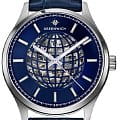 Мужские механические часы с минеральным стекломМинеральное стеклоМинеральное стекло представляет собой искусственно выращенный минерал кварца. Такое стекло отличается особой устойчивостью к повреждениям и царапинам. Уступает по некоторым качествам сапфировому стеклу. Greenwich Globe GW 056.16.36. Корпус часов изготовлен из стали. Стрелки с люминесцентным покрытиемЛюминесцентное покрытиеПозволяет считывать показания времени в темноте. Производители наносят на стрелки, часовые индексы, безель или поверхность циферблата светонакопительный состав, дающий холодное свечение.. Класс водозащиты: 100 метров, позволит плавать, нырять и заниматься другими водными видами спорта. Кожаный ремешок на стандартной застёжке.