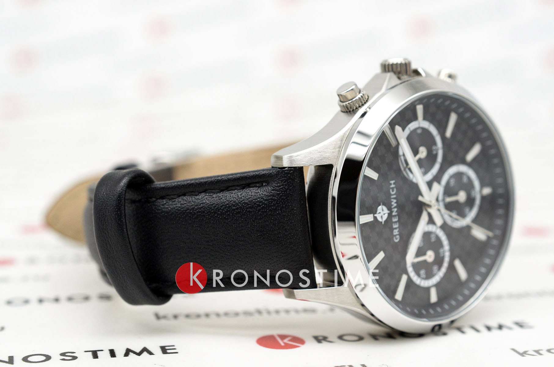 Женские кварцевые часы Greenwich из коллекции Mermaid — это сочетание элегантности и функциональности. Корпус диаметром 35 мм выполнен из нержавеющей стали. Циферблат чёрного цвета оформлен с эффектом гильоше в виде волнообразных линий, придающим ему объём и глубину. На циферблате расположены субциферблаты хронографа (секундомер на 60 секунд и 30 минут) и индикатор 24-часового формата. Все индикаторы выделены рамками с зеркальной полировкой. Стрелки и метки с люминесцентным покрытиемЛюминесцентное покрытиеПозволяет считывать показания времени в темноте. Производители наносят на стрелки, часовые индексы, безель или поверхность циферблата светонакопительный состав, дающий холодное свечение., обеспечивающим хорошую читаемость в темноте. Циферблат защищён минеральным стекломМинеральное стеклоМинеральное стекло представляет собой искусственно выращенный минерал кварца. Такое стекло отличается особой устойчивостью к повреждениям и царапинам. Уступает по некоторым качествам сапфировому стеклу.. Механизм — кварцевый калибр Miyota с функцией хронографа. Часы оснащены кожаным ремешком чёрного цвета с классической пряжкой из нержавеющей стали. Водонепроницаемость 100 м позволяет использовать часы для плавания и повседневного ношения. Гарантия — 24 месяца. Идеальный выбор для тех, кто ценит стиль, точность и надёжность.