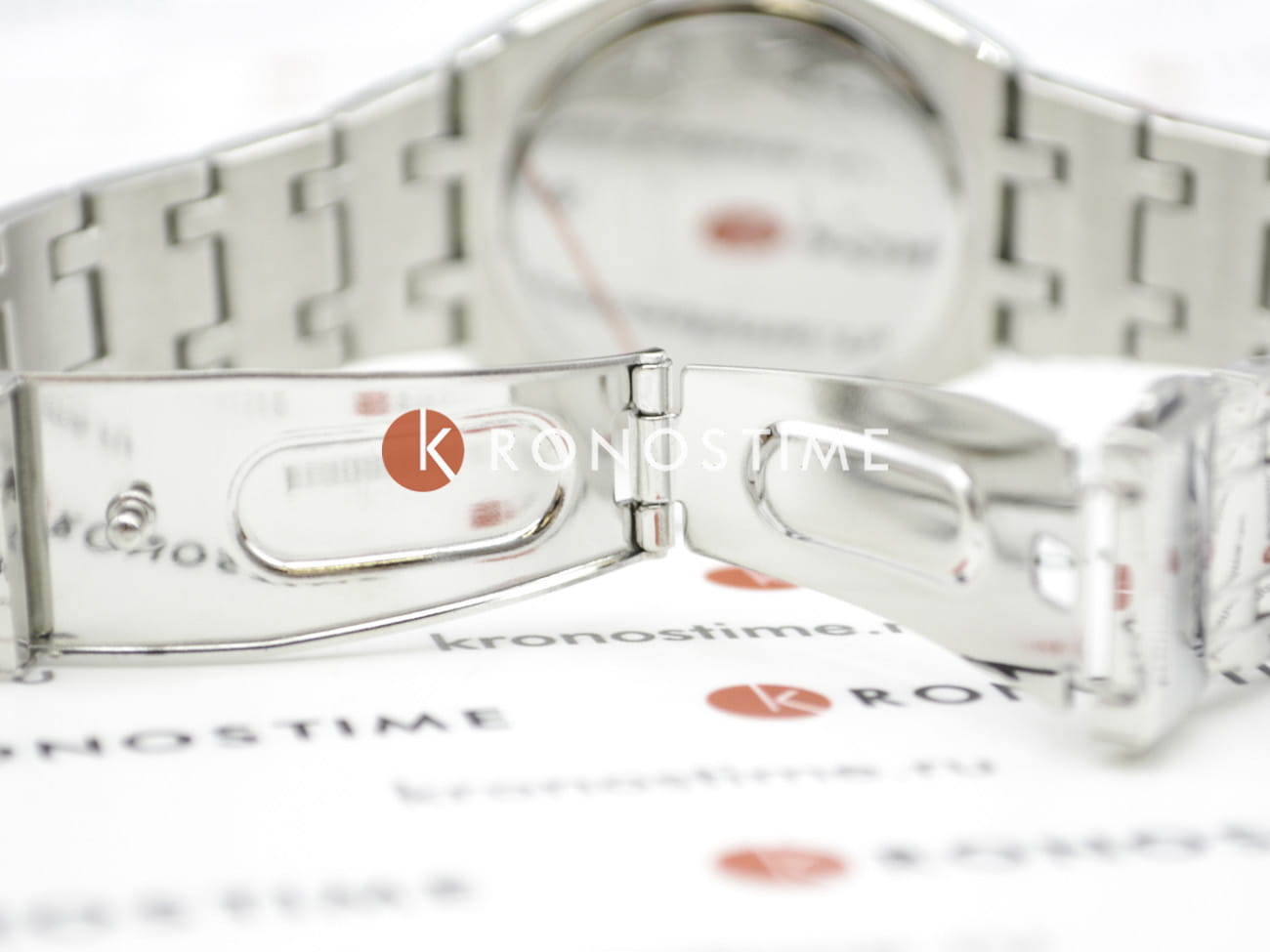 Стальной корпус круглой формы. Отсчет данных ведут три элегантные стрелки. Прочный браслет с раскладной застёжкойРаскладная застёжкаТакой тип застёжки используется только на браслетах из металла. Она никогда не раскрывается полностью, происходит разделение на 2 и более частей. Раскладывающая застёжка снизит вероятность потери часов к минимуму. будет надежно сидеть на запястье. Элегантный безельБезельВнешний ободок, закрепляющий стекло. В спортивных часах так называется поворотное кольцо с делениями на циферблате, выполняет роль таймера – замеряет отрезки времени на шкале. Неподвижный безель – элемент декора. Однонаправленно вращающийся безель на дайверских часах позволяет фиксировать моменты погружения и выныривания на поверхность. с ослепительными кристаллами. Вставлено минеральное стеклоМинеральное стеклоМинеральное стекло представляет собой искусственно выращенный минерал кварца. Такое стекло отличается особой устойчивостью к повреждениям и царапинам. Уступает по некоторым качествам сапфировому стеклу. с закалкой. Кварцевый механизм.