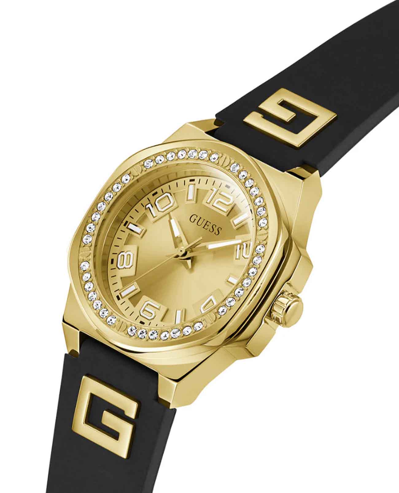 Женские наручные часы Guess Sport GW0617L5 с минеральным стекломМинеральное стеклоМинеральное стекло представляет собой искусственно выращенный минерал кварца. Такое стекло отличается особой устойчивостью к повреждениям и царапинам. Уступает по некоторым качествам сапфировому стеклу., кварцевый механизм с высокой точностью. Корпус часов изготовлен из нержавеющей стали с IP-покрытиемIP-покрытиеМетод ионного напыления. Демонстрирует повышенную устойчивость к истиранию, окислению и химическим веществам. Под воздействием высокого давления и температуры около 1500°C молекулы металла надёжно соединяются с частицами корпуса часов.. БезельБезельВнешний ободок, закрепляющий стекло. В спортивных часах так называется поворотное кольцо с делениями на циферблате, выполняет роль таймера – замеряет отрезки времени на шкале. Неподвижный безель – элемент декора. Однонаправленно вращающийся безель на дайверских часах позволяет фиксировать моменты погружения и выныривания на поверхность. украшен кристаллами. Стрелки с люминесцентным покрытиемЛюминесцентное покрытиеПозволяет считывать показания времени в темноте. Производители наносят на стрелки, часовые индексы, безель или поверхность циферблата светонакопительный состав, дающий холодное свечение.. Класс водозащиты: 50 метров, позволит защитить корпус от случайных брызг или капель дождя. Силиконовый ремешок на стандартной застежке.