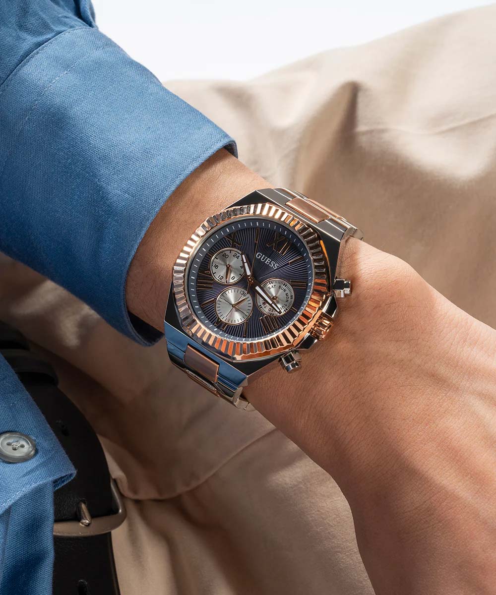Часы Guess Sport GW0703G4 представляют собой практичный и стильный аксессуар, который отлично дополнит ваш повседневный образ. Эти мужские часы оснащены надежным кварцевым механизмом и выполнены в прочном стальном корпусе. Диаметр корпуса составляет 44 мм. Рифленым безелемБезельВнешний ободок, закрепляющий стекло. В спортивных часах так называется поворотное кольцо с делениями на циферблате, выполняет роль таймера – замеряет отрезки времени на шкале. Неподвижный безель – элемент декора. Однонаправленно вращающийся безель на дайверских часах позволяет фиксировать моменты погружения и выныривания на поверхность. с IP-покрытиемIP-покрытиеМетод ионного напыления. Демонстрирует повышенную устойчивость к истиранию, окислению и химическим веществам. Под воздействием высокого давления и температуры около 1500°C молекулы металла надёжно соединяются с частицами корпуса часов. цвета розового золота придает часам стильный и современный вид. Черный циферблат, выполненный по технологии Sunray, создает эффект солнечных лучей и добавляет глубину дизайну. Гильошированный узор, метки в виде штрихов и римских цифр подчеркивают элегантность модели. Часы также оснащены функцией отображения времени в 12-ти и 24-х часовом формате, а также отдельными циферблатами для отображения дня недели, что делает их особенно удобными для повседневного использования. Люминесцентное покрытиеЛюминесцентное покрытиеПозволяет считывать показания времени в темноте. Производители наносят на стрелки, часовые индексы, безель или поверхность циферблата светонакопительный состав, дающий холодное свечение. на стрелках обеспечивает отличную видимость в темноте. Рифленая заводная головка с защитой обеспечивает дополнительное удобство и надежность. Стальной браслет на раскладной застежкеРаскладная застёжкаТакой тип застёжки используется только на браслетах из металла. Она никогда не раскрывается полностью, происходит разделение на 2 и более частей. Раскладывающая застёжка снизит вероятность потери часов к минимуму. гарантирует комфорт и безопасность при носке. Минеральное стеклоМинеральное стеклоМинеральное стекло представляет собой искусственно выращенный минерал кварца. Такое стекло отличается особой устойчивостью к повреждениям и царапинам. Уступает по некоторым качествам сапфировому стеклу. защищает циферблат от царапин и других повреждений, а водозащита 50WR позволяет не беспокоиться о попадании воды при случайном контакте. Эти часы не только практичны, но и станут стильным дополнением вашего гардероба, подчеркивая вашу уверенность и внимание к деталям.