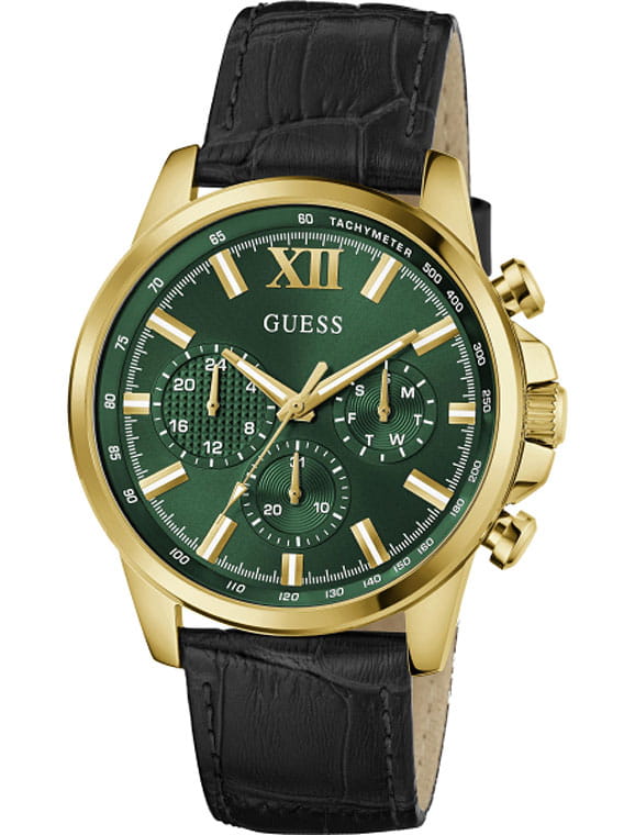 Стильные и функциональные часы Guess GW0901G4 оснащены кварцевым механизмом, что обеспечивает точность и надежность в использовании. Корпус выполнен из прочной стали с золотистым PVD-покрытиемPVDУльтратонкое покрытие наносится в технике вакуумного напыления, сочетает в себе нитрид титана особой прочности со слоем золота или оксида хрома. Несёт в себе декоративную или защитную функцию., придающей изделиям утонченный и современный вид. Циферблат украшен метками в виде штрихов и римской цифрой XII, обеспечивающими легкое считывание времени. Время отображается в двух форматах — 12-ти и 24-х часовом, что удобно для тех, кто привык к разным системам времени. Дополнительные циферблаты показывают дату и день недели, что позволяет всегда быть в курсе текущей даты без необходимости использования других устройств. Часы также оснащены тахиметромТахиметрРазмеченная шкала, располагается на ободке или безеле часов. Тахиметр позволяет рассчитать скорость на определённом участке пути, расстояние измеряется в километрах или милях., что добавляет им функциональности и может быть полезно для измерения скорости. Люминесцентное покрытиеЛюминесцентное покрытиеПозволяет считывать показания времени в темноте. Производители наносят на стрелки, часовые индексы, безель или поверхность циферблата светонакопительный состав, дающий холодное свечение. на стрелках и метках обеспечивает отличную видимость в темноте. Минеральное стеклоМинеральное стеклоМинеральное стекло представляет собой искусственно выращенный минерал кварца. Такое стекло отличается особой устойчивостью к повреждениям и царапинам. Уступает по некоторым качествам сапфировому стеклу. защищает циферблат от царапин и повреждений, а водозащита 50WR позволяет не волноваться о случайных контактах с водой, например, во время дождя. Кожаный черный ремешок с классической застежкой обеспечивает надежную фиксацию часов на руке и комфорт в ношении. Рифленая заводная головка с защитой добавляет изысканности и одновременно защищает механизм от повреждений. Эти часы идеально подойдут для тех, кто ценит стиль, функциональность и качество в одном аксессуаре.
