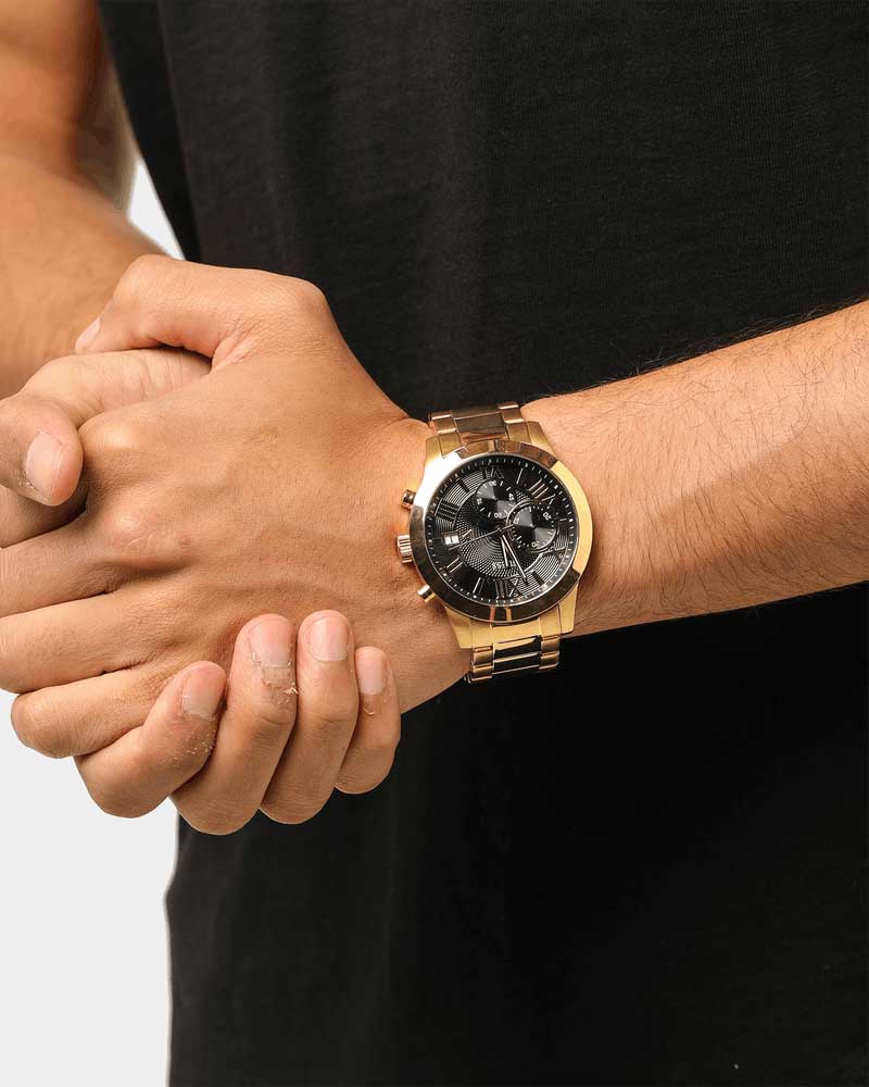 Мужские наручные часы Guess Dress Steel W0668G8, кварцевый механизм с высокой точностью. Класс водозащиты: 50 метров, позволит защитить корпус от случайных брызг или капель дождя. Корпус часов изготовлен из стали, золотистого цвета.