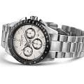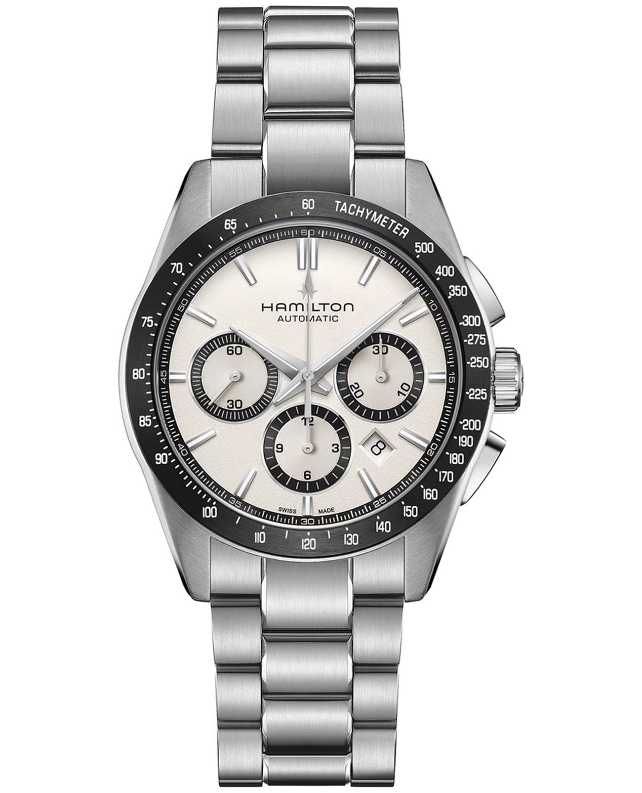 Мужские швейцарские часы Hamilton Jazzmaster Performer Auto Chrono H36606110 представляют собой элегантный хронографХронографФункция позволяет измерять отрезки времени с особой точностью: часы, минуты, секунды. Верным признаком хронографа является наличие на циферблате 3 дополнительных окошек-счётчиков. с автоматическим механизмом, идеально сочетающий классический стиль и современные технологии. Модель выполнена в круглом корпусе диаметром 42 мм из высококачественной нержавеющей стали 316L, дополненном стильным белым циферблатом, контрастным черным безелем и массивным стальным браслетом с удобной застежкой. Внутри корпуса работает надежный автоматический калибр H-31 с увеличенным запасом хода 60 часов, оснащенный функцией хронографаХронографФункция позволяет измерять отрезки времени с особой точностью: часы, минуты, секунды. Верным признаком хронографа является наличие на циферблате 3 дополнительных окошек-счётчиков., тахиметрической шкалой и удобной индикацией даты. Циферблат защищен прочным сапфировым стекломСапфировое стеклоПрочный и надёжный материал из кристалла сапфира синтетического происхождения, характеризующийся особой твёрдостью и устойчивостью к царапинам и повреждениям. с антибликовым покрытием, а люминесцентные стрелки и индексы Super-LumiNova®Люминесцентное покрытиеПозволяет считывать показания времени в темноте. Производители наносят на стрелки, часовые индексы, безель или поверхность циферблата светонакопительный состав, дающий холодное свечение. обеспечивают превосходную видимость в любых условиях освещения. Часы обладают водонепроницаемостью 10 бар (100 метров), что делает их подходящими для плавания и водных видов спорта. Особой гордостью модели является использование инновационной балансовой пружины из сплава Nivachron™Nivachron™Специально разработанный инновационный сплав Nivachron™ повышает устойчивость часов к воздействию магнитных полей., которая обеспечивает повышенную устойчивость к магнитным полям и исключительную точность хода.