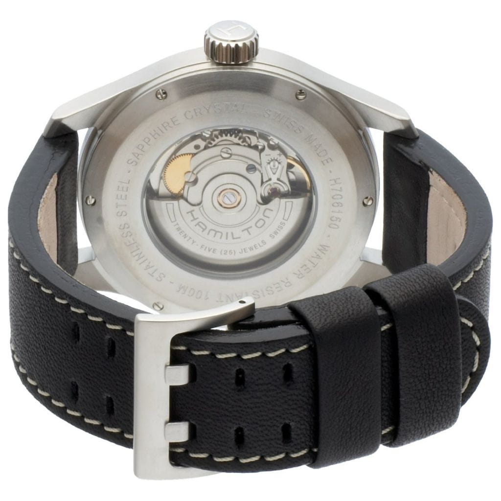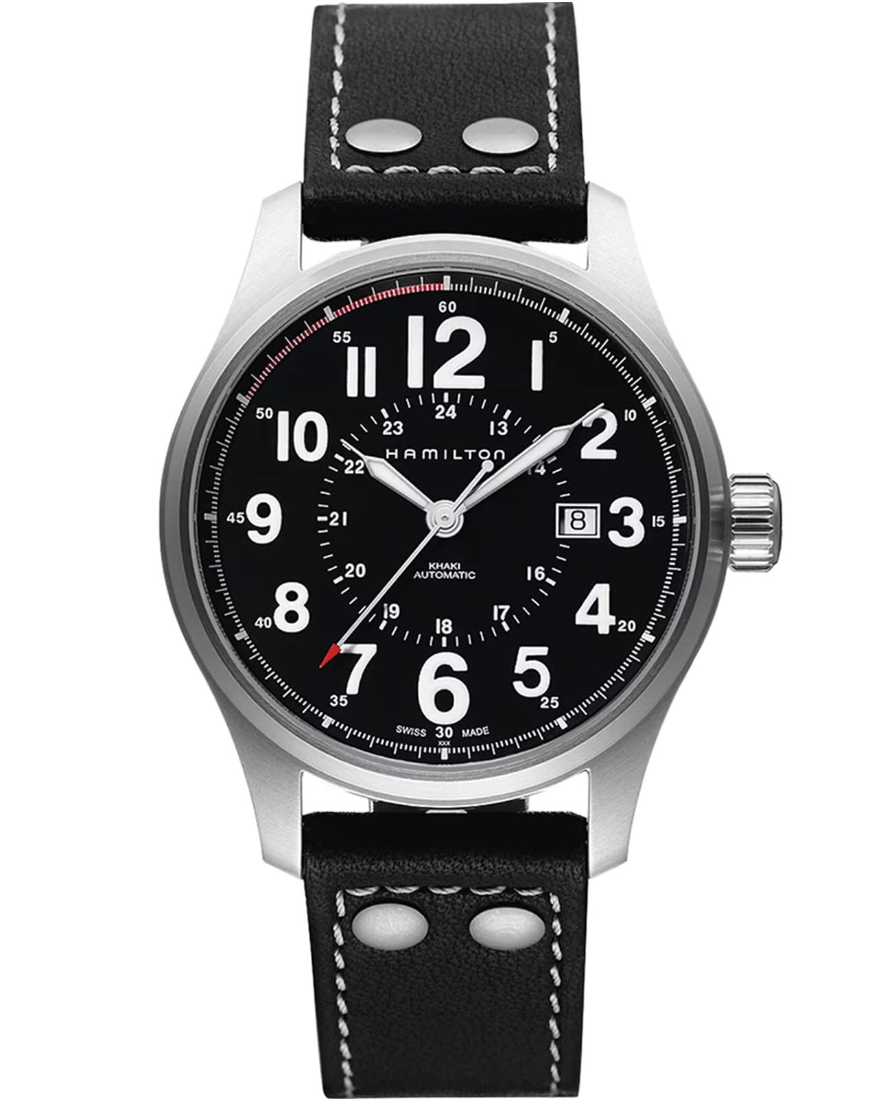 Мужские швейцарские часы Hamilton Khaki Field Auto H70615733, механический механизм (автоматический калибр) с высокой точностью. Сапфировое стеклоСапфировое стеклоПрочный и надёжный материал из кристалла сапфира синтетического происхождения, характеризующийся особой твёрдостью и устойчивостью к царапинам и повреждениям., устойчивое к появлению царапин, обладающее высокой прозрачностью. Класс водозащиты: 100 метров, позволит плавать, нырять и заниматься другими водными видами спорта. Корпус часов изготовлен из нержавеющей стали. Окошко даты находится в положении 3 часа. Кожаный ремешок на стандартной застёжке. Стрелки и метки с люминесцентным покрытиемЛюминесцентное покрытиеПозволяет считывать показания времени в темноте. Производители наносят на стрелки, часовые индексы, безель или поверхность циферблата светонакопительный состав, дающий холодное свечение..