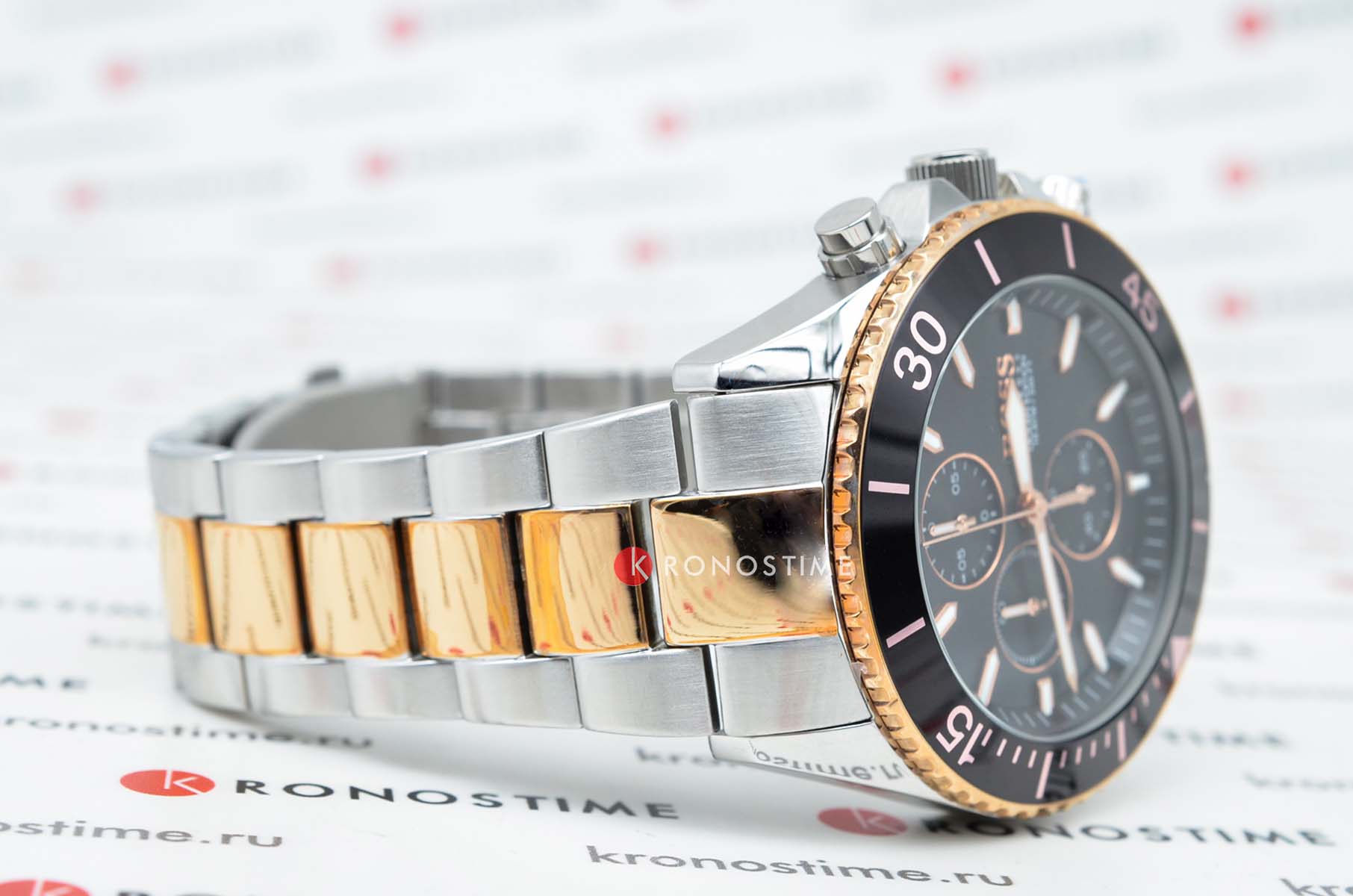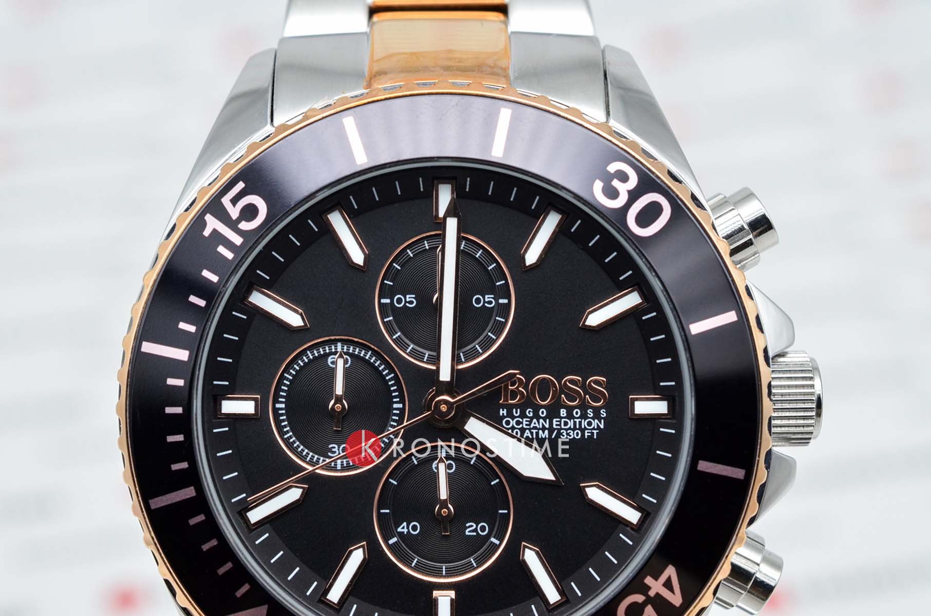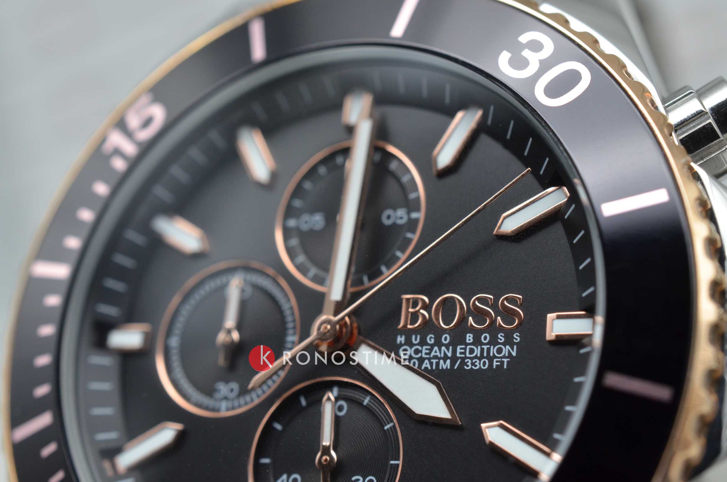 Мужские часы Hugo Boss Ocean HB1513705 представлены в изысканном 48-мм корпусе из нержавеющей стали с поворотным безелемБезельВнешний ободок, закрепляющий стекло. В спортивных часах так называется поворотное кольцо с делениями на циферблате, выполняет роль таймера – замеряет отрезки времени на шкале. Неподвижный безель – элемент декора. Однонаправленно вращающийся безель на дайверских часах позволяет фиксировать моменты погружения и выныривания на поверхность. с IP-покрытиемIP-покрытиеМетод ионного напыления. Демонстрирует повышенную устойчивость к истиранию, окислению и химическим веществам. Под воздействием высокого давления и температуры около 1500°C молекулы металла надёжно соединяются с частицами корпуса часов.. Элегантная модель оснащена кварцевым механизмом с функциями хронографаХронографФункция позволяет измерять отрезки времени с особой точностью: часы, минуты, секунды. Верным признаком хронографа является наличие на циферблате 3 дополнительных окошек-счётчиков. и секундомераСекундомерСекундоме́р — прибор, способный измерять интервалы времени с точностью до долей секунды.. Черный циферблат защищен устойчивым к царапинам минеральным стекломМинеральное стеклоМинеральное стекло представляет собой искусственно выращенный минерал кварца. Такое стекло отличается особой устойчивостью к повреждениям и царапинам. Уступает по некоторым качествам сапфировому стеклу.. Браслет из стали с IP-покрытиемIP-покрытиеМетод ионного напыления. Демонстрирует повышенную устойчивость к истиранию, окислению и химическим веществам. Под воздействием высокого давления и температуры около 1500°C молекулы металла надёжно соединяются с частицами корпуса часов. дополнен раскладной застёжкойРаскладная застёжкаТакой тип застёжки используется только на браслетах из металла. Она никогда не раскрывается полностью, происходит разделение на 2 и более частей. Раскладывающая застёжка снизит вероятность потери часов к минимуму., а стрелки и метки покрыты люминесцентным составомЛюминесцентное покрытиеПозволяет считывать показания времени в темноте. Производители наносят на стрелки, часовые индексы, безель или поверхность циферблата светонакопительный состав, дающий холодное свечение. для видимости в темноте. Водонепроницаемость 100 метров (10 ATM) позволяет использовать часы для плавания других водных видов спорта. Точность хода составляет ±15 секунд в месяц, что соответствует стандартам кварцевых механизмов. Дизайн модели сочетает спортивную функциональность с элегантным стилем.