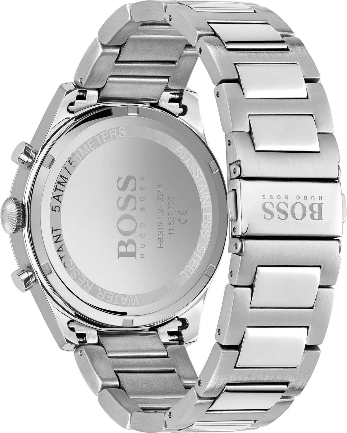 Мужские часы Hugo Boss Pioneer HB1513867 представлены в круглом 44-мм корпусе из нержавеющей стали 316L. Оснащены кварцевым механизмом с функциями хронографаХронографФункция позволяет измерять отрезки времени с особой точностью: часы, минуты, секунды. Верным признаком хронографа является наличие на циферблате 3 дополнительных окошек-счётчиков. и секундомеромСекундомерСекундоме́р — прибор, способный измерять интервалы времени с точностью до долей секунды., а также индикацией даты. Зеленый циферблат с метками в виде штрихов защищен устойчивым к царапинам минеральным стекломМинеральное стеклоМинеральное стекло представляет собой искусственно выращенный минерал кварца. Такое стекло отличается особой устойчивостью к повреждениям и царапинам. Уступает по некоторым качествам сапфировому стеклу.. Браслет из нержавеющей стали 316L дополнен раскладной застёжкойРаскладная застёжкаТакой тип застёжки используется только на браслетах из металла. Она никогда не раскрывается полностью, происходит разделение на 2 и более частей. Раскладывающая застёжка снизит вероятность потери часов к минимуму.. Водонепроницаемость 50 метров (5 ATM) обеспечивает защиту от брызг и дождя.