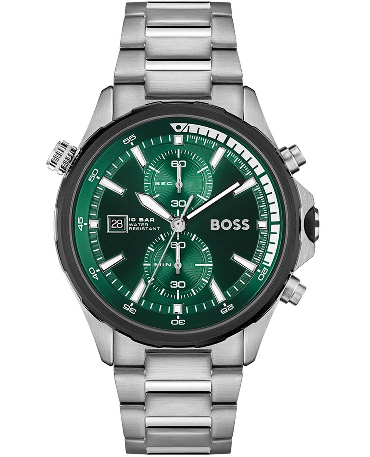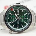 Мужские часы Hugo Boss Globetrotter HB 1513930 представлены в круглом 46-мм корпусе из нержавеющей стали с IP-покрытиемIP-покрытиеМетод ионного напыления. Демонстрирует повышенную устойчивость к истиранию, окислению и химическим веществам. Под воздействием высокого давления и температуры около 1500°C молекулы металла надёжно соединяются с частицами корпуса часов.. Оснащены кварцевым механизмом с функциями хронографаХронографФункция позволяет измерять отрезки времени с особой точностью: часы, минуты, секунды. Верным признаком хронографа является наличие на циферблате 3 дополнительных окошек-счётчиков. и секундомеромСекундомерСекундоме́р — прибор, способный измерять интервалы времени с точностью до долей секунды.. Зеленый циферблат защищен устойчивым к царапинам минеральным стекломМинеральное стеклоМинеральное стекло представляет собой искусственно выращенный минерал кварца. Такое стекло отличается особой устойчивостью к повреждениям и царапинам. Уступает по некоторым качествам сапфировому стеклу.. Стальной браслет серебристого цвета дополнен раскладной застёжкойРаскладная застёжкаТакой тип застёжки используется только на браслетах из металла. Она никогда не раскрывается полностью, происходит разделение на 2 и более частей. Раскладывающая застёжка снизит вероятность потери часов к минимуму., а стрелки покрыты люминесцентным составомЛюминесцентное покрытиеПозволяет считывать показания времени в темноте. Производители наносят на стрелки, часовые индексы, безель или поверхность циферблата светонакопительный состав, дающий холодное свечение. для видимости в темноте. Водонепроницаемость 100 метров (10 ATM) позволяет использовать часы для плавания.