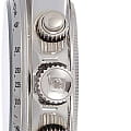 Часы оснащены функцией хронографаХронографФункция позволяет измерять отрезки времени с особой точностью: часы, минуты, секунды. Верным признаком хронографа является наличие на циферблате 3 дополнительных окошек-счётчиков. и тахиметрТахиметрРазмеченная шкала, располагается на ободке или безеле часов. Тахиметр позволяет рассчитать скорость на определённом участке пути, расстояние измеряется в километрах или милях., что позволяет точно измерять скорость и время различных событий. Циферблат защищен прочным минеральным стекломМинеральное стеклоМинеральное стекло представляет собой искусственно выращенный минерал кварца. Такое стекло отличается особой устойчивостью к повреждениям и царапинам. Уступает по некоторым качествам сапфировому стеклу., обеспечивающим высокую устойчивость к царапинам. Завинчивающаяся рифленая заводная головка с защитой гарантирует надежную герметизацию механизма, а завинчивающаяся задняя крышка добавляет дополнительную защиту от внешних воздействий.