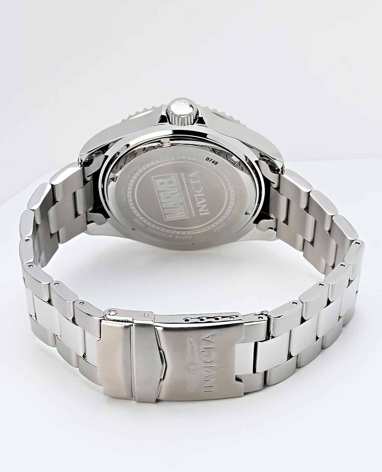 Мужские наручные часы Invicta IN29680 из коллекции Marvel Captain America сочетают в себе динамичный дизайн и надежность современных технологий . БезельБезельВнешний ободок, закрепляющий стекло. В спортивных часах так называется поворотное кольцо с делениями на циферблате, выполняет роль таймера – замеряет отрезки времени на шкале. Неподвижный безель – элемент декора. Однонаправленно вращающийся безель на дайверских часах позволяет фиксировать моменты погружения и выныривания на поверхность. с IP-покрытиемIP-покрытиеМетод ионного напыления. Демонстрирует повышенную устойчивость к истиранию, окислению и химическим веществам. Под воздействием высокого давления и температуры около 1500°C молекулы металла надёжно соединяются с частицами корпуса часов., что обеспечивает высокую устойчивость к внешним воздействиям . Браслет выполнен из нержавеющей стали оснащен раскладной застежкойРаскладная застёжкаТакой тип застёжки используется только на браслетах из металла. Она никогда не раскрывается полностью, происходит разделение на 2 и более частей. Раскладывающая застёжка снизит вероятность потери часов к минимуму., гарантирующей комфортное ношение и безопасность . Циферблат представлен в белом, синем и черном цветах, дополнен люминесцентными метками Tritnite, которые обеспечивают отличную видимость в темноте . Для защиты используется минеральное стеклоМинеральное стеклоМинеральное стекло представляет собой искусственно выращенный минерал кварца. Такое стекло отличается особой устойчивостью к повреждениям и царапинам. Уступает по некоторым качествам сапфировому стеклу., обеспечивающее прочную защиту от царапин . Часы работают на кварцевом механизме Seiko Hattori PC21J, что гарантирует точное время без необходимости подзаводки . Водонепроницаемость модели достигает 10 атмосфер (100 метров), что позволяет использовать их во время плавания и других водных видов спорта .