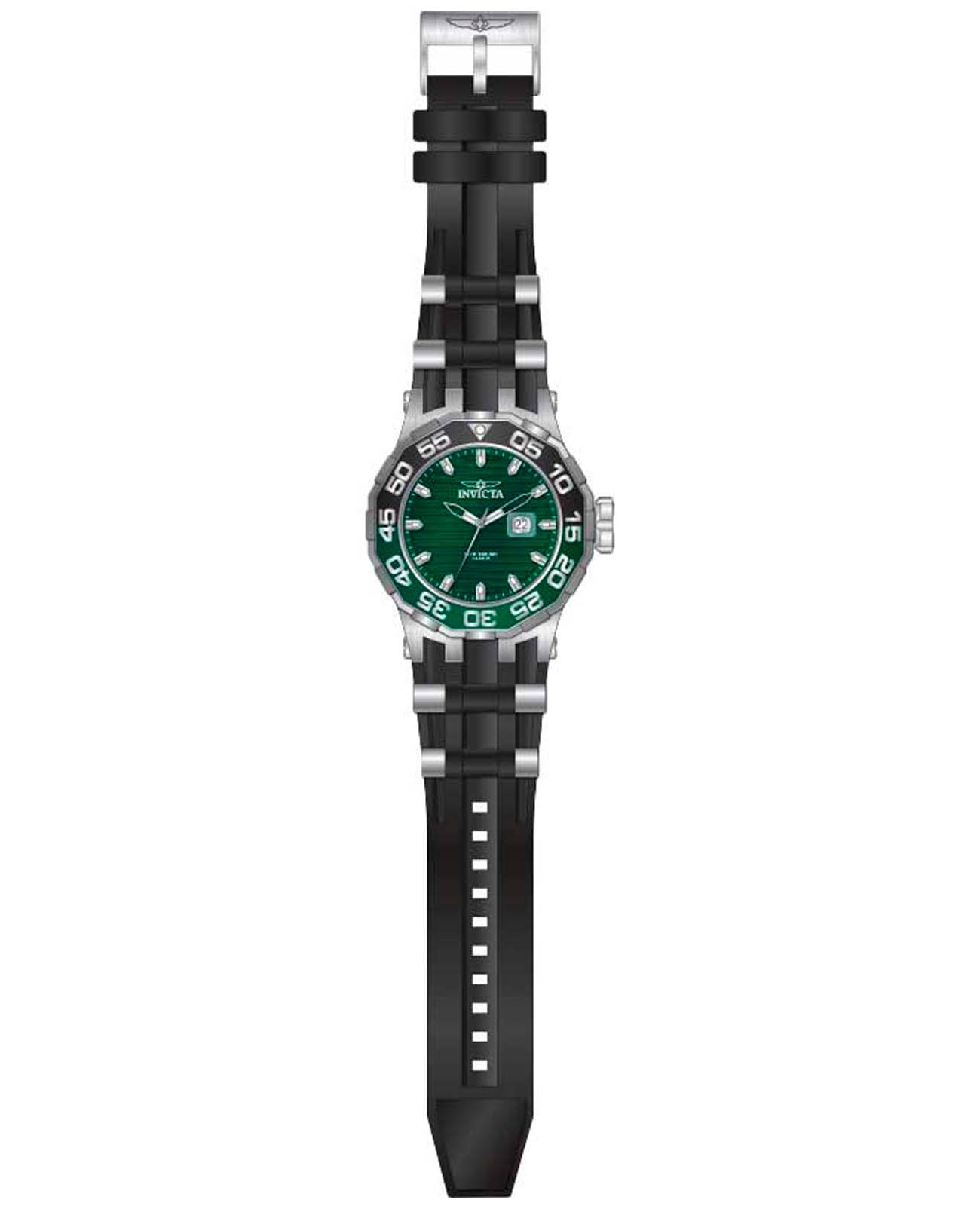 Мужские наручные часы Invicta Specialty IN38694 сочетают в себе спортивный дизайн и высокую функциональность, что делает их отличным выбором для активных мужчин . Модель обладает круглым корпусом, выполненным из нержавеющей стали и алюминиевой вставкой, что обеспечивает устойчивость к внешним воздействиям и стильный внешний вид . БезельБезельВнешний ободок, закрепляющий стекло. В спортивных часах так называется поворотное кольцо с делениями на циферблате, выполняет роль таймера – замеряет отрезки времени на шкале. Неподвижный безель – элемент декора. Однонаправленно вращающийся безель на дайверских часах позволяет фиксировать моменты погружения и выныривания на поверхность. с IP-покрытиемIP-покрытиеМетод ионного напыления. Демонстрирует повышенную устойчивость к истиранию, окислению и химическим веществам. Под воздействием высокого давления и температуры около 1500°C молекулы металла надёжно соединяются с частицами корпуса часов.. Циферблат зеленого цвета дополнен метками в виде штрихов и светящимися стрелками с люминесцентным покрытиемЛюминесцентное покрытиеПозволяет считывать показания времени в темноте. Производители наносят на стрелки, часовые индексы, безель или поверхность циферблата светонакопительный состав, дающий холодное свечение. Tritnite, гарантирующими отличную видимость даже в темное время суток .  Ремешок часов выполнен из силикона черного цвета со стальными вставками, который обеспечивает комфорт при длительной носке. Фиксация осуществляется с помощью классической застежки . Для защиты циферблата используется минеральное стеклоМинеральное стеклоМинеральное стекло представляет собой искусственно выращенный минерал кварца. Такое стекло отличается особой устойчивостью к повреждениям и царапинам. Уступает по некоторым качествам сапфировому стеклу., оснащенное антибликовым покрытием, что делает его устойчивым к царапинам и бликам . Часы оснащены кварцевым механизмом, обеспечивающим высокую точность хода без необходимости подзаводки. Водонепроницаемость модели достигает 500 метров (50 атмосфер), что позволяет использовать их во время плавания, дайвинга и других водных видов спорта . Корпус часов также оборудован винтовой коронкой для дополнительной защиты механизма от попадания воды . Сочетание практичности, надежности и стильного дизайна делает эту модель универсальным аксессуаром как для повседневной носки, так и для занятий спортом.