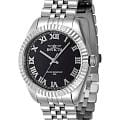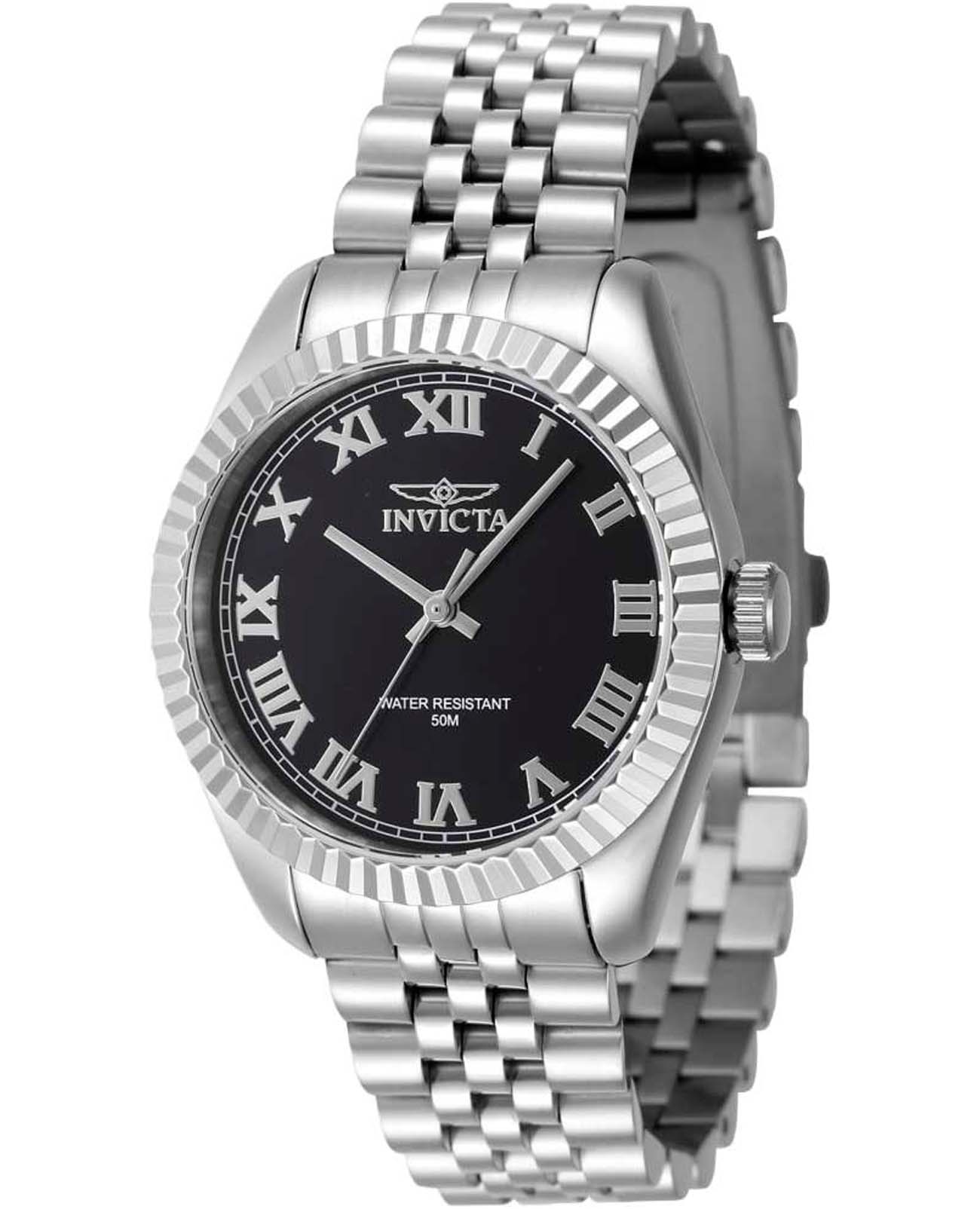 Женские наручные часы Invicta Specialty IN47408 сочетают в себе элегантный дизайн и надежность современных технологий . Модель обладает круглым корпусом, выполненным из нержавеющей стали, что обеспечивает высокую устойчивость к внешним воздействиям. БезельБезельВнешний ободок, закрепляющий стекло. В спортивных часах так называется поворотное кольцо с делениями на циферблате, выполняет роль таймера – замеряет отрезки времени на шкале. Неподвижный безель – элемент декора. Однонаправленно вращающийся безель на дайверских часах позволяет фиксировать моменты погружения и выныривания на поверхность. украшен рифленой отделкой с алмазной гранью, придающей часам дополнительную роскошь . Браслет также изготовлен из нержавеющей стали и оснащен раскладывающейся застежкойРаскладной замокДанный вариант застежки используется только на часах с металлическим браслетом. Отличительная особенность такого крепления в том, что длина браслета становится универсальной и вы можете самостоятельно отрегулировать нужный вам размер – застежка просто двигается по браслету часов., гарантирующей комфортное ношение и безопасность . Черный циферблат дополнен серебристыми стрелками и римскими цифрами в качестве часовых меток, а также минутными делениями по внешнему краю . Для защиты используется минеральное стеклоМинеральное стеклоМинеральное стекло представляет собой искусственно выращенный минерал кварца. Такое стекло отличается особой устойчивостью к повреждениям и царапинам. Уступает по некоторым качествам сапфировому стеклу., которое обеспечивает прочность и устойчивость к царапинам . Часы оснащены кварцевым механизмом калибра Seiko PC21, что гарантирует точность хода без необходимости подзаводки . Водонепроницаемость модели достигает 50 метров (5 атмосфер), что позволяет использовать их в повседневной жизни, включая контакт с водой, например, при мытье рук или дожде . Сочетание классического дизайна и функциональности делает эту модель универсальным аксессуаром для различных случаев жизни.