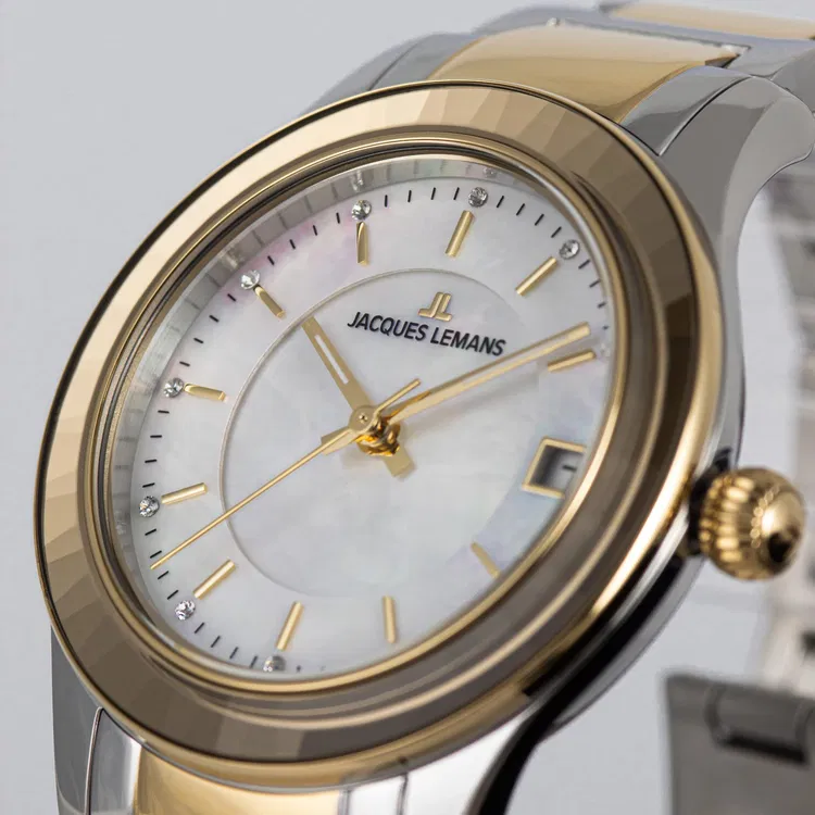 Австрийские женские часы Jacques Lemans 1-2194F имеют кварцевый механизм с высокой точностью. Минеральное стеклоМинеральное стеклоМинеральное стекло представляет собой искусственно выращенный минерал кварца. Такое стекло отличается особой устойчивостью к повреждениям и царапинам. Уступает по некоторым качествам сапфировому стеклу., устойчивое к появлению царапин, обладает высокой прозрачностью. Корпус часов изготовлен из нержавеющей стали. Стрелки с люминесцентным покрытиемЛюминесцентное покрытиеПозволяет считывать показания времени в темноте. Производители наносят на стрелки, часовые индексы, безель или поверхность циферблата светонакопительный состав, дающий холодное свечение.. Класс водозащиты: 50 метров, позволит принимать душ или плавать, не снимая часов. Стальной браслет на раскладной застёжкеРаскладная застёжкаТакой тип застёжки используется только на браслетах из металла. Она никогда не раскрывается полностью, происходит разделение на 2 и более частей. Раскладывающая застёжка снизит вероятность потери часов к минимуму.. БезельБезельВнешний ободок, закрепляющий стекло. В спортивных часах так называется поворотное кольцо с делениями на циферблате, выполняет роль таймера – замеряет отрезки времени на шкале. Неподвижный безель – элемент декора. Однонаправленно вращающийся безель на дайверских часах позволяет фиксировать моменты погружения и выныривания на поверхность. с IP-покрытиемIP-покрытиеМетод ионного напыления. Демонстрирует повышенную устойчивость к истиранию, окислению и химическим веществам. Под воздействием высокого давления и температуры около 1500°C молекулы металла надёжно соединяются с частицами корпуса часов..