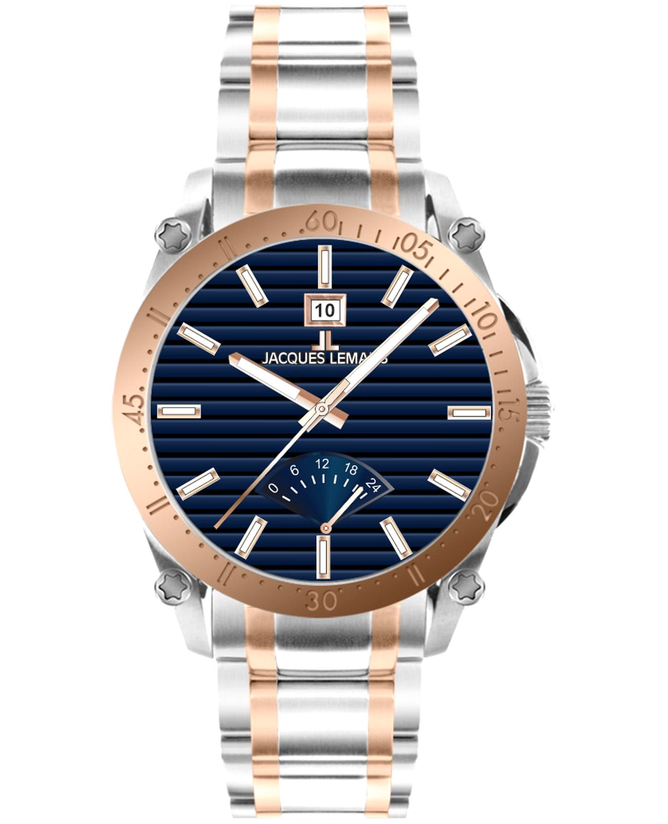 Мужские кварцевые часы Jacques Lemans 1-2202Q – лаконичная красота и изысканная элегантность. Оригинальная модель с классическим оформлением станет превосходным завершением образа, наделив его индивидуальным характером. Корпус выполнен из нержавеющей стали, диаметром 44 мм, что обеспечивает долговечность и утончённый внешний вид. Минеральное стеклоМинеральное стеклоМинеральное стекло представляет собой искусственно выращенный минерал кварца. Такое стекло отличается особой устойчивостью к повреждениям и царапинам. Уступает по некоторым качествам сапфировому стеклу. с сапфировым напылением защищает циферблат от царапин. Стальной браслет с частичным PVD-покрытиемPVDУльтратонкое покрытие наносится в технике вакуумного напыления, сочетает в себе нитрид титана особой прочности со слоем золота или оксида хрома. Несёт в себе декоративную или защитную функцию. на раскладной застёжкеРаскладная застёжкаТакой тип застёжки используется только на браслетах из металла. Она никогда не раскрывается полностью, происходит разделение на 2 и более частей. Раскладывающая застёжка снизит вероятность потери часов к минимуму. обеспечивает комфортное ношение. На неподвижный безельБезельВнешний ободок, закрепляющий стекло. В спортивных часах так называется поворотное кольцо с делениями на циферблате, выполняет роль таймера – замеряет отрезки времени на шкале. Неподвижный безель – элемент декора. Однонаправленно вращающийся безель на дайверских часах позволяет фиксировать моменты погружения и выныривания на поверхность. с PVD-покрытиемPVDУльтратонкое покрытие наносится в технике вакуумного напыления, сочетает в себе нитрид титана особой прочности со слоем золота или оксида хрома. Несёт в себе декоративную или защитную функцию. нанесена минутная шкала. Водозащита 100 метров позволит плавать, нырять и заниматься другими водными видами спорта. Стрелки и метки с люминесцентным покрытиемЛюминесцентное покрытиеПозволяет считывать показания времени в темноте. Производители наносят на стрелки, часовые индексы, безель или поверхность циферблата светонакопительный состав, дающий холодное свечение. позволяющие легко определять время даже в темноте. Окошко даты находится в положении 12 часов. Индикатор 24-х часов вынесен на отдельный циферблат. Рифленая заводная головка с защитой. Это аксессуар для мужчины, который ценит классический стиль и функциональность.