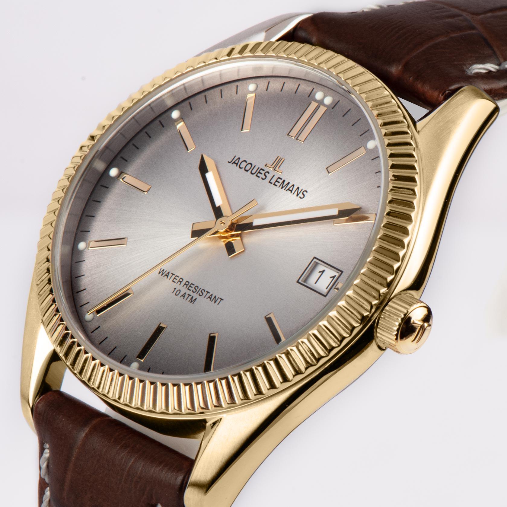 Мужские часы Jacques Lemans Derby 50-3X с минеральным стекломМинеральное стеклоМинеральное стекло представляет собой искусственно выращенный минерал кварца. Такое стекло отличается особой устойчивостью к повреждениям и царапинам. Уступает по некоторым качествам сапфировому стеклу., кварцевый механизм с высокой точностью. Корпус часов из нержавеющей стали с PVD-покрытиемPVDУльтратонкое покрытие наносится в технике вакуумного напыления, сочетает в себе нитрид титана особой прочности со слоем золота или оксида хрома. Несёт в себе декоративную или защитную функцию.. БезельБезельВнешний ободок, закрепляющий стекло. В спортивных часах так называется поворотное кольцо с делениями на циферблате, выполняет роль таймера – замеряет отрезки времени на шкале. Неподвижный безель – элемент декора. Однонаправленно вращающийся безель на дайверских часах позволяет фиксировать моменты погружения и выныривания на поверхность. с PVD-покрытиемPVDУльтратонкое покрытие наносится в технике вакуумного напыления, сочетает в себе нитрид титана особой прочности со слоем золота или оксида хрома. Несёт в себе декоративную или защитную функцию.. Стрелки с люминесцентным покрытиемЛюминесцентное покрытиеПозволяет считывать показания времени в темноте. Производители наносят на стрелки, часовые индексы, безель или поверхность циферблата светонакопительный состав, дающий холодное свечение.. Окошко даты в положении 3 часа. Класс водозащиты: 100 метров, позволит плавать, нырять и заниматься другими водными видами спорта. Кожаный ремешок на стандартной застежке.