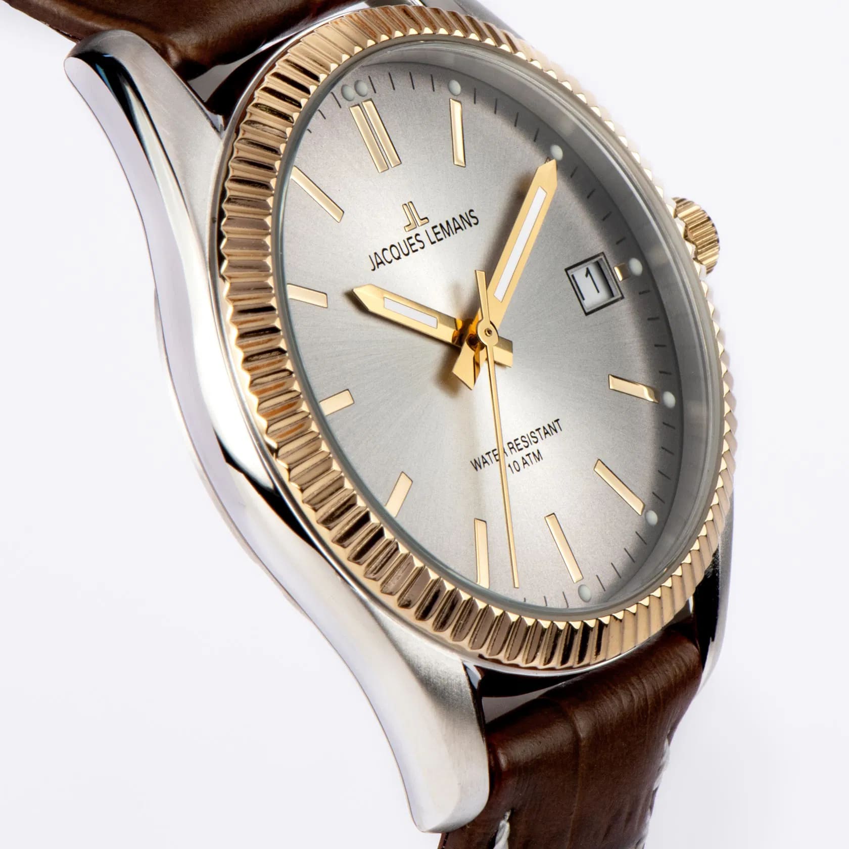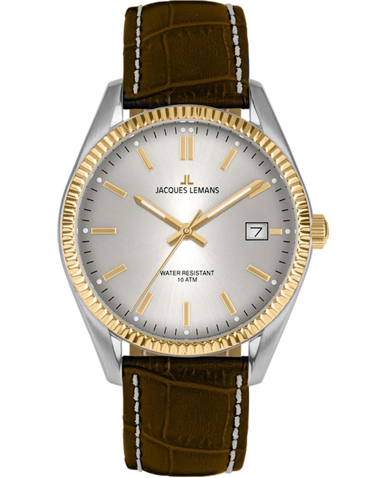 Женские часы Jacques Lemans Derby 50-4V с минеральным стекломМинеральное стеклоМинеральное стекло представляет собой искусственно выращенный минерал кварца. Такое стекло отличается особой устойчивостью к повреждениям и царапинам. Уступает по некоторым качествам сапфировому стеклу., кварцевый механизм с высокой точностью. Корпус часов из нержавеющей стали. Стрелки с люминесцентным покрытиемЛюминесцентное покрытиеПозволяет считывать показания времени в темноте. Производители наносят на стрелки, часовые индексы, безель или поверхность циферблата светонакопительный состав, дающий холодное свечение.. Окошко даты в положении 3 часа. Класс водозащиты: 100 метров, позволит плавать, нырять и заниматься другими водными видами спорта. Кожаный ремешок на стандартной застежке. БезельБезельВнешний ободок, закрепляющий стекло. В спортивных часах так называется поворотное кольцо с делениями на циферблате, выполняет роль таймера – замеряет отрезки времени на шкале. Неподвижный безель – элемент декора. Однонаправленно вращающийся безель на дайверских часах позволяет фиксировать моменты погружения и выныривания на поверхность. с PVD-покрытиемPVDУльтратонкое покрытие наносится в технике вакуумного напыления, сочетает в себе нитрид титана особой прочности со слоем золота или оксида хрома. Несёт в себе декоративную или защитную функцию..