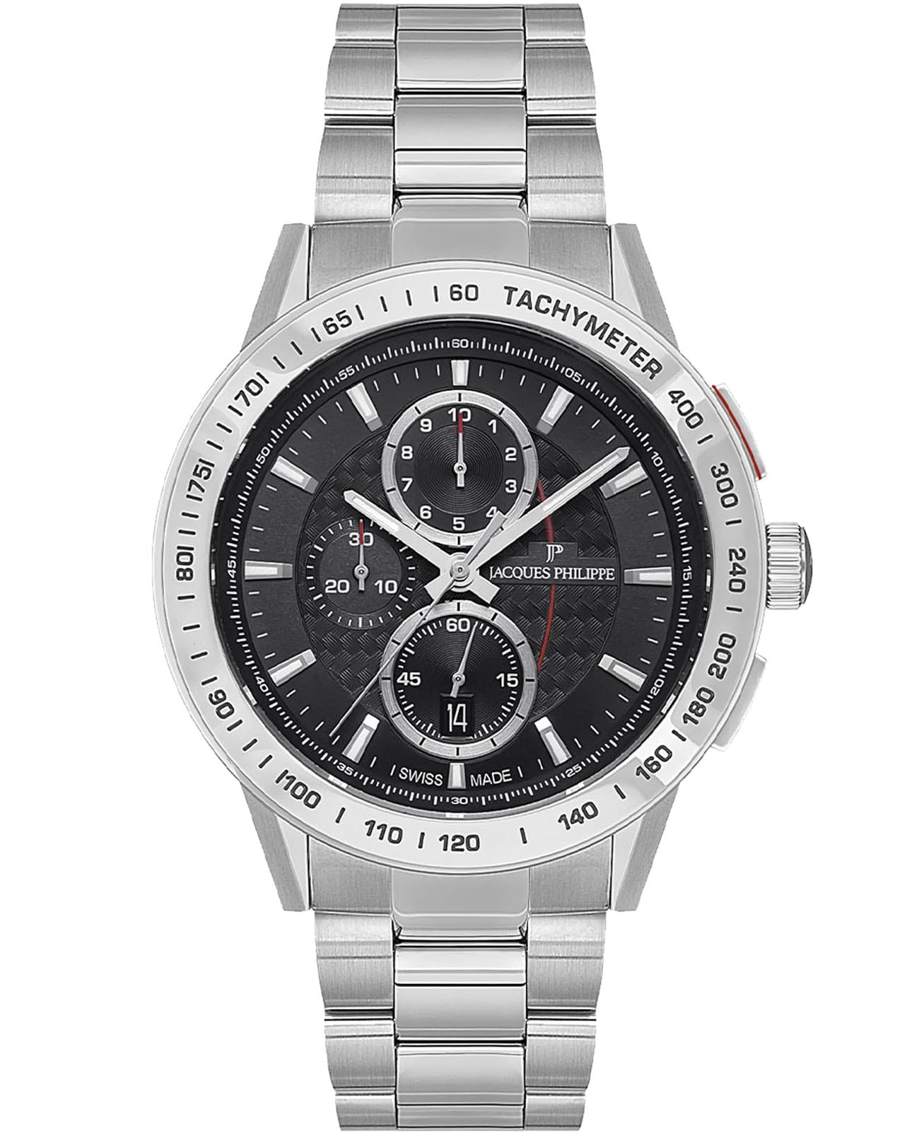 Швейцарские мужские часы-хронографХронографФункция позволяет измерять отрезки времени с особой точностью: часы, минуты, секунды. Верным признаком хронографа является наличие на циферблате 3 дополнительных окошек-счётчиков. с секундомеромСекундомерСекундоме́р — прибор, способный измерять интервалы времени с точностью до долей секунды. Jacques Philippe Globus JPQGC281316V2, кварцевый механизм с высокой точностью. Сапфировое стеклоСапфировое стеклоПрочный и надёжный материал из кристалла сапфира синтетического происхождения, характеризующийся особой твёрдостью и устойчивостью к царапинам и повреждениям. устойчивое к появлению царапин, обладающее высокой прозрачностью. Корпус часов изготовлен из нержавеющей стали. БезельБезельВнешний ободок, закрепляющий стекло. В спортивных часах так называется поворотное кольцо с делениями на циферблате, выполняет роль таймера – замеряет отрезки времени на шкале. Неподвижный безель – элемент декора. Однонаправленно вращающийся безель на дайверских часах позволяет фиксировать моменты погружения и выныривания на поверхность. из стали с тахиметромТахиметрРазмеченная шкала, располагается на ободке или безеле часов. Тахиметр позволяет рассчитать скорость на определённом участке пути, расстояние измеряется в километрах или милях.. На циферблате три дополнительных индикатора. Окошко даты находится в положении 6 часов. Стрелки с люминесцентным покрытиемЛюминесцентное покрытиеПозволяет считывать показания времени в темноте. Производители наносят на стрелки, часовые индексы, безель или поверхность циферблата светонакопительный состав, дающий холодное свечение.. Класс водозащиты: 100 метров, позволит плавать, нырять и заниматься другими водными видами спорта. Стальной браслет на застёжке «бабочка» с кнопкамиЗастёжка "бабочка"Такой вид застёжки дополняется предохранителями, помогающими избежать случайного раскрытия браслета. Обладают изящным исполнением. .