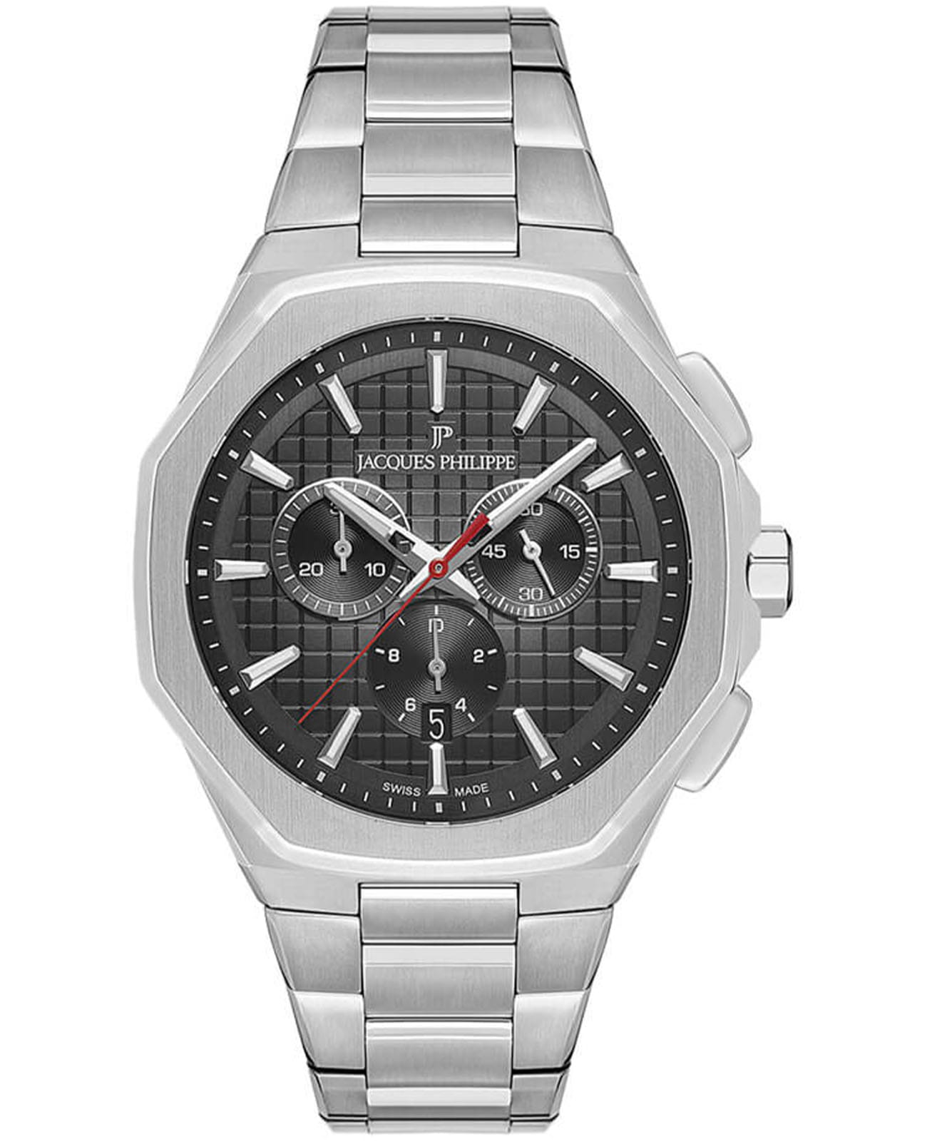 Швейцарские мужские часы-хронографХронографФункция позволяет измерять отрезки времени с особой точностью: часы, минуты, секунды. Верным признаком хронографа является наличие на циферблате 3 дополнительных окошек-счётчиков. с секундомеромСекундомерСекундоме́р — прибор, способный измерять интервалы времени с точностью до долей секунды. Jacques Philippe Octagon JPQGC391316, кварцевый механизм с высокой точностью. Сапфировое стеклоСапфировое стеклоПрочный и надёжный материал из кристалла сапфира синтетического происхождения, характеризующийся особой твёрдостью и устойчивостью к царапинам и повреждениям. устойчивое к появлению царапин, обладающее высокой прозрачностью. Корпус часов изготовлен из нержавеющей стали. На циферблате три дополнительных индикатора. Стрелки и метки с люминесцентным покрытиемЛюминесцентное покрытиеПозволяет считывать показания времени в темноте. Производители наносят на стрелки, часовые индексы, безель или поверхность циферблата светонакопительный состав, дающий холодное свечение.. Окошко даты находится в положении 6 часов. Класс водозащиты: 50 метров, позволит защитить корпус от случайных брызг или капель дождя. Стальной браслет на застёжке «бабочка» с кнопкамиЗастёжка "бабочка"Такой вид застёжки дополняется предохранителями, помогающими избежать случайного раскрытия браслета. Обладают изящным исполнением. .