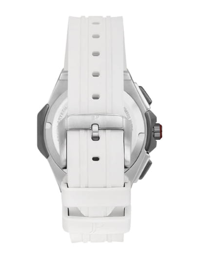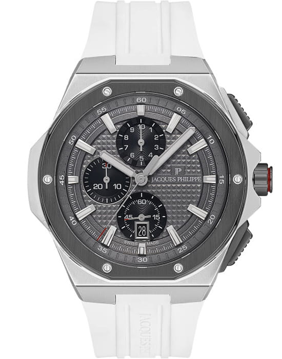 Швейцарские мужские часы-хронографХронографФункция позволяет измерять отрезки времени с особой точностью: часы, минуты, секунды. Верным признаком хронографа является наличие на циферблате 3 дополнительных окошек-счётчиков. с секундомеромСекундомерСекундоме́р — прибор, способный измерять интервалы времени с точностью до долей секунды. Jacques Philippe Esquire JPQGC488440, кварцевый механизм с высокой точностью. Сапфировое стеклоСапфировое стеклоПрочный и надёжный материал из кристалла сапфира синтетического происхождения, характеризующийся особой твёрдостью и устойчивостью к царапинам и повреждениям. устойчивое к появлению царапин, обладающее высокой прозрачностью. Корпус часов изготовлен из нержавеющей стали. На циферблате три дополнительных индикатора. Стрелки и метки с люминесцентным покрытиемЛюминесцентное покрытиеПозволяет считывать показания времени в темноте. Производители наносят на стрелки, часовые индексы, безель или поверхность циферблата светонакопительный состав, дающий холодное свечение.. Шкала тахиметраТахиметрРазмеченная шкала, располагается на ободке или безеле часов. Тахиметр позволяет рассчитать скорость на определённом участке пути, расстояние измеряется в километрах или милях. на циферблате. Класс водозащиты: 50 метров, позволит защитить корпус от случайных брызг или капель дождя. Силиконовый ремешок.