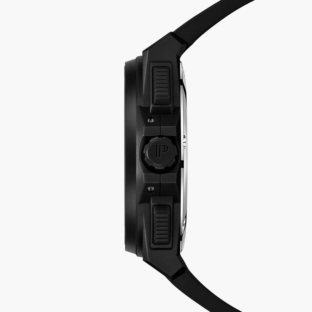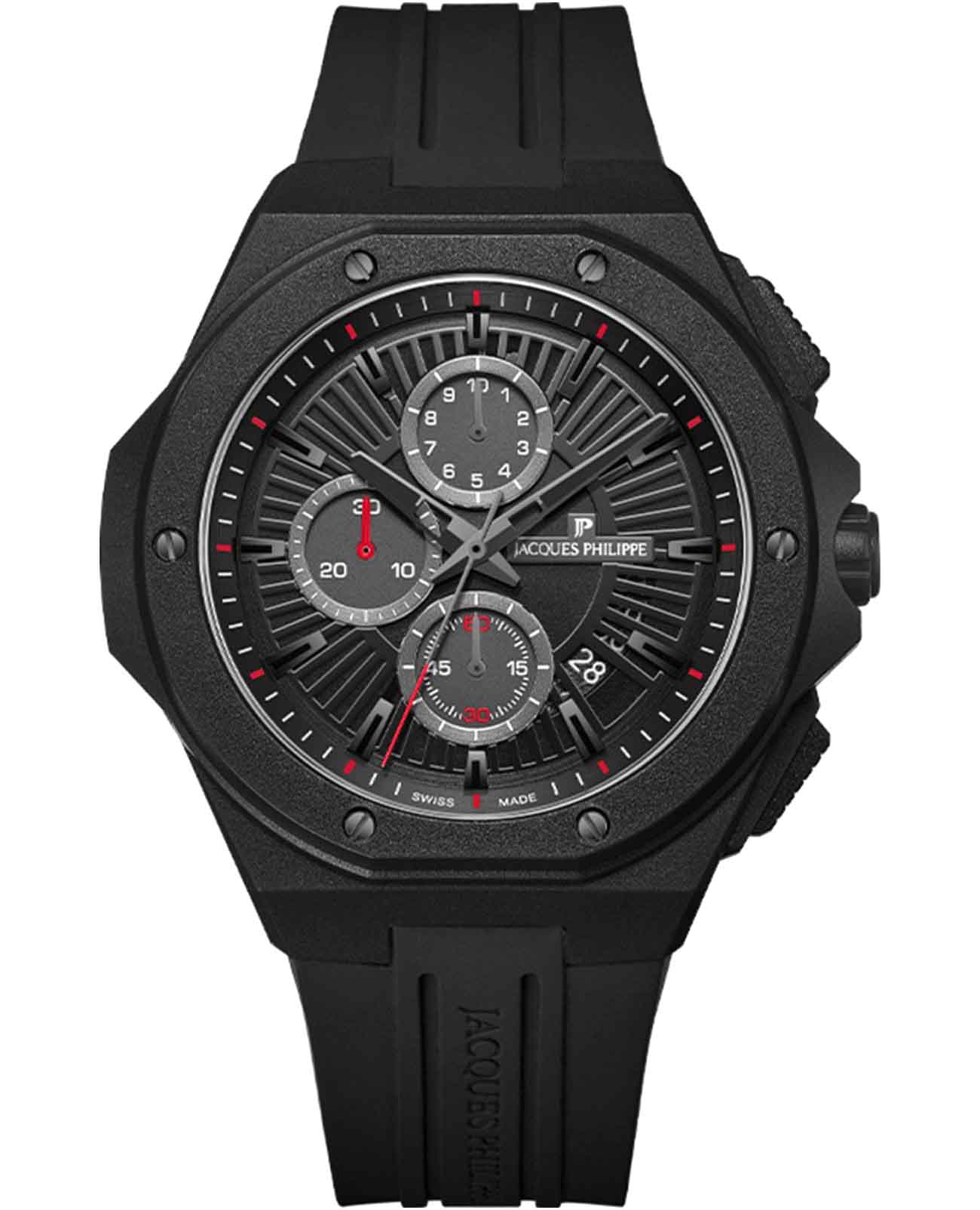 Часы Jacques Philippe JPQGC514411 из коллекции Militia — стильные швейцарские часы с функцией хронографаХронографФункция позволяет измерять отрезки времени с особой точностью: часы, минуты, секунды. Верным признаком хронографа является наличие на циферблате 3 дополнительных окошек-счётчиков. и секундомераСекундомерСекундоме́р — прибор, способный измерять интервалы времени с точностью до долей секунды., которые сочетают в себе элегантность и современный функционал. Модель оснащена надежным кварцевым механизмом, обеспечивающим высокую точность хода. Корпус выполнен из нержавеющей стали 316L с износостойким черным IP-покрытиемIP-покрытиеМетод ионного напыления. Демонстрирует повышенную устойчивость к истиранию, окислению и химическим веществам. Под воздействием высокого давления и температуры около 1500°C молекулы металла надёжно соединяются с частицами корпуса часов., диаметр корпуса составляет 48 мм, толщина — 12,5 мм. Сапфировое стеклоСапфировое стеклоПрочный и надёжный материал из кристалла сапфира синтетического происхождения, характеризующийся особой твёрдостью и устойчивостью к царапинам и повреждениям. защищает часы от царапин и сохраняет прозрачность даже при активном использовании. Черный циферблат дополнен тремя дополнительными индикаторами и окошком даты в положении 4 часа, а стрелки имеют люминесцентное покрытиеЛюминесцентное покрытиеПозволяет считывать показания времени в темноте. Производители наносят на стрелки, часовые индексы, безель или поверхность циферблата светонакопительный состав, дающий холодное свечение. для удобства чтения времени в темноте. Силиконовый браслет шириной 26 мм и длиной 19 см надежно фиксируется на запястье стандартной застежкой и обеспечивает комфорт при носке. Водозащита 5 АТМ позволяет не снимать часы при мытье рук или прогулках под дождём.