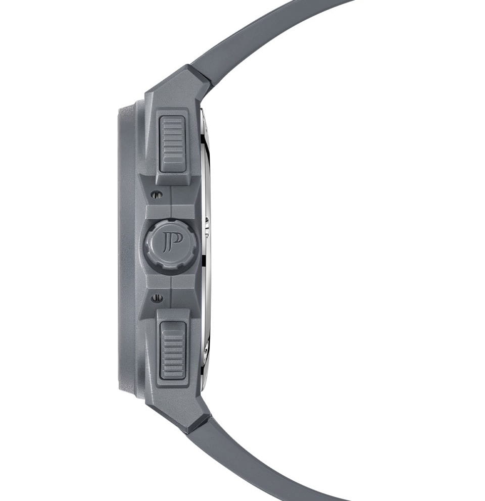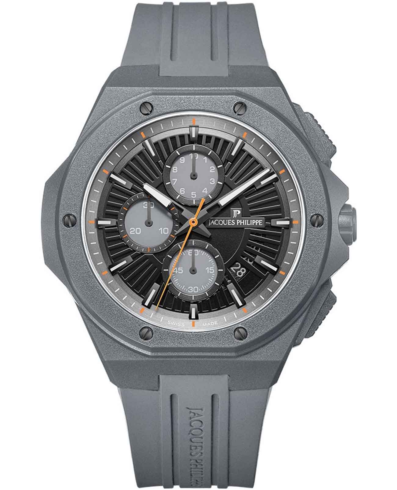 Часы Jacques Philippe JPQGC518447 из коллекции Militia — стильные швейцарские часы с функцией хронографаХронографФункция позволяет измерять отрезки времени с особой точностью: часы, минуты, секунды. Верным признаком хронографа является наличие на циферблате 3 дополнительных окошек-счётчиков. и секундомераСекундомерСекундоме́р — прибор, способный измерять интервалы времени с точностью до долей секунды., которые сочетают в себе элегантность и современный функционал. Модель оснащена надежным кварцевым механизмом, обеспечивающим высокую точность хода. Корпус выполнен из нержавеющей стали 316L с износостойким серым IP-покрытиемIP-покрытиеМетод ионного напыления. Демонстрирует повышенную устойчивость к истиранию, окислению и химическим веществам. Под воздействием высокого давления и температуры около 1500°C молекулы металла надёжно соединяются с частицами корпуса часов., диаметр корпуса составляет 48 мм, толщина — 12,5 мм. Сапфировое стеклоСапфировое стеклоПрочный и надёжный материал из кристалла сапфира синтетического происхождения, характеризующийся особой твёрдостью и устойчивостью к царапинам и повреждениям. защищает часы от царапин и сохраняет прозрачность даже при активном использовании. Черный циферблат дополнен тремя дополнительными индикаторами и окошком даты в положении 4 часа, а стрелки имеют люминесцентное покрытиеЛюминесцентное покрытиеПозволяет считывать показания времени в темноте. Производители наносят на стрелки, часовые индексы, безель или поверхность циферблата светонакопительный состав, дающий холодное свечение. для удобства чтения времени в темноте. Силиконовый браслет шириной 26 мм и длиной 19 см надежно фиксируется на запястье стандартной застежкой и обеспечивает комфорт при носке. Водозащита 5 АТМ позволяет не снимать часы при мытье рук или прогулках под дождём.