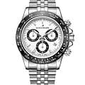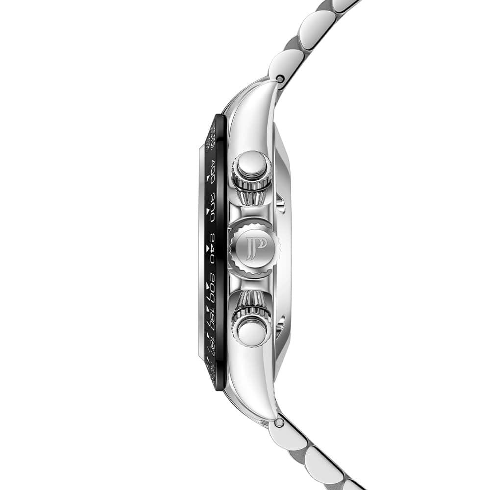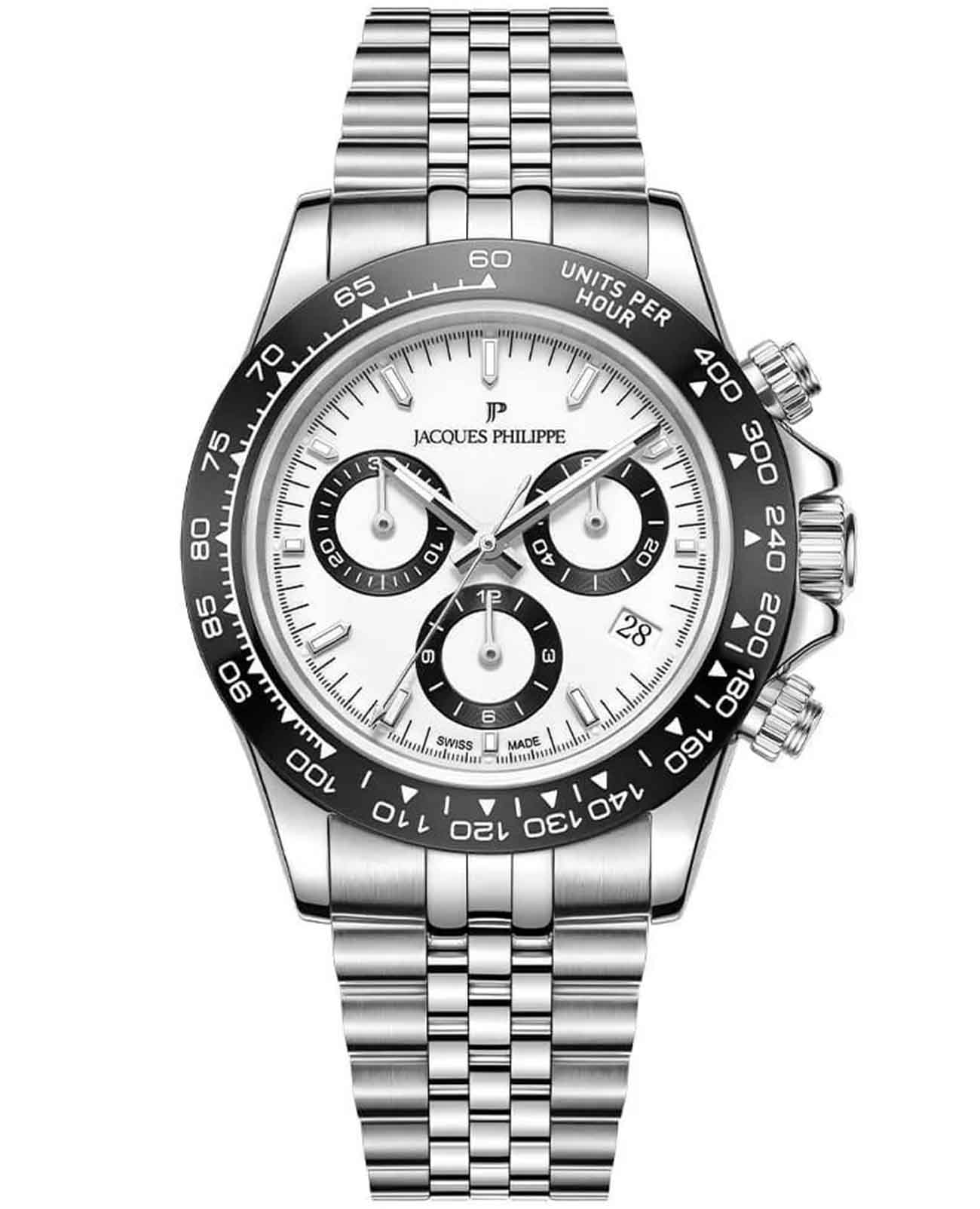 Швейцарские наручные часы Jacques Philippe JPQGC711326SBB сочетают в себе современный дизайн, надежность и функциональность, это стильные швейцарские часы с функцией хронографаХронографФункция позволяет измерять отрезки времени с особой точностью: часы, минуты, секунды. Верным признаком хронографа является наличие на циферблате 3 дополнительных окошек-счётчиков. и секундомераСекундомерСекундоме́р — прибор, способный измерять интервалы времени с точностью до долей секунды.. Корпус круглой формы диаметром 39 мм выполнен из прочной нержавеющей стали, а безельБезельВнешний ободок, закрепляющий стекло. В спортивных часах так называется поворотное кольцо с делениями на циферблате, выполняет роль таймера – замеряет отрезки времени на шкале. Неподвижный безель – элемент декора. Однонаправленно вращающийся безель на дайверских часах позволяет фиксировать моменты погружения и выныривания на поверхность. с элегантным черным IP-покрытиемIP-покрытиеМетод ионного напыления. Демонстрирует повышенную устойчивость к истиранию, окислению и химическим веществам. Под воздействием высокого давления и температуры около 1500°C молекулы металла надёжно соединяются с частицами корпуса часов., а сапфировое стеклоСапфировое стеклоПрочный и надёжный материал из кристалла сапфира синтетического происхождения, характеризующийся особой твёрдостью и устойчивостью к царапинам и повреждениям. надежно защищает белый циферблат от царапин и повреждений. Модель оснащена точным кварцевым механизмом RONDA 5030.D-4H, а также дополнительными функциями — тахиметромТахиметрРазмеченная шкала, располагается на ободке или безеле часов. Тахиметр позволяет рассчитать скорость на определённом участке пути, расстояние измеряется в километрах или милях. и индикатором даты, что делает часы не только стильным аксессуаром, но и практичным помощником на каждый день. Серебристый браслет шириной 20 мм удобно фиксируется на запястье с помощью застежки «бабочка»Застёжка "бабочка"Такой вид застёжки дополняется предохранителями, помогающими избежать случайного раскрытия браслета. Обладают изящным исполнением. . Стрелки имеют люминесцентное покрытиеЛюминесцентное покрытиеПозволяет считывать показания времени в темноте. Производители наносят на стрелки, часовые индексы, безель или поверхность циферблата светонакопительный состав, дающий холодное свечение. для удобства чтения времени в темноте. Водозащита 5 АТМ позволяет не снимать часы при дожде и случайных контактах с водой.
