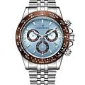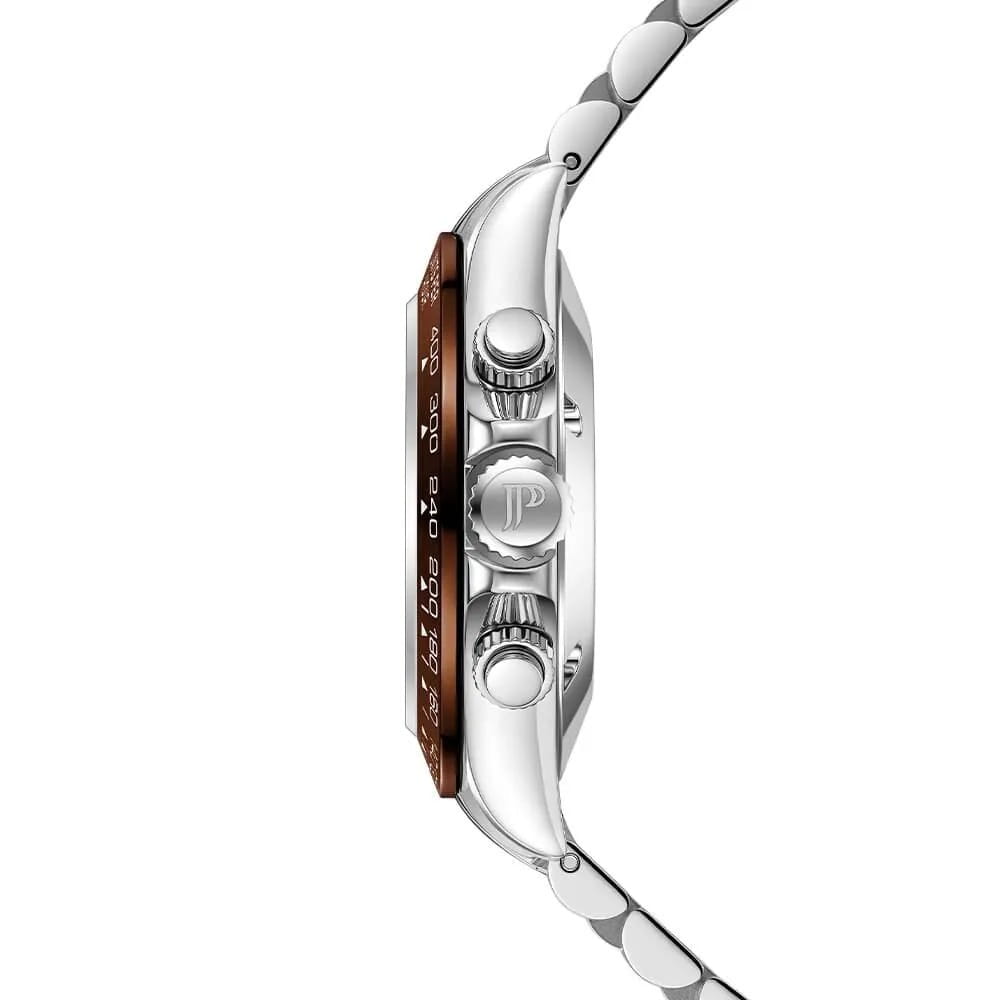 Швейцарские наручные часы Jacques Philippe JPQGC7113X6SBBR сочетают в себе современный дизайн, надежность и функциональность, это стильные швейцарские часы с функцией хронографаХронографФункция позволяет измерять отрезки времени с особой точностью: часы, минуты, секунды. Верным признаком хронографа является наличие на циферблате 3 дополнительных окошек-счётчиков. и секундомераСекундомерСекундоме́р — прибор, способный измерять интервалы времени с точностью до долей секунды.. Корпус круглой формы диаметром 39 мм выполнен из прочной нержавеющей стали, а безельБезельВнешний ободок, закрепляющий стекло. В спортивных часах так называется поворотное кольцо с делениями на циферблате, выполняет роль таймера – замеряет отрезки времени на шкале. Неподвижный безель – элемент декора. Однонаправленно вращающийся безель на дайверских часах позволяет фиксировать моменты погружения и выныривания на поверхность. с элегантным коричневым IP-покрытиемIP-покрытиеМетод ионного напыления. Демонстрирует повышенную устойчивость к истиранию, окислению и химическим веществам. Под воздействием высокого давления и температуры около 1500°C молекулы металла надёжно соединяются с частицами корпуса часов., а сапфировое стеклоСапфировое стеклоПрочный и надёжный материал из кристалла сапфира синтетического происхождения, характеризующийся особой твёрдостью и устойчивостью к царапинам и повреждениям. надежно защищает голубой циферблат от царапин и повреждений. Модель оснащена точным кварцевым механизмом RONDA 5030.D-4H, а также дополнительными функциями — тахиметромТахиметрРазмеченная шкала, располагается на ободке или безеле часов. Тахиметр позволяет рассчитать скорость на определённом участке пути, расстояние измеряется в километрах или милях. и индикатором даты, что делает часы не только стильным аксессуаром, но и практичным помощником на каждый день. Серебристый браслет шириной 20 мм удобно фиксируется на запястье с помощью застежки «бабочка»Застёжка "бабочка"Такой вид застёжки дополняется предохранителями, помогающими избежать случайного раскрытия браслета. Обладают изящным исполнением. . Стрелки имеют люминесцентное покрытиеЛюминесцентное покрытиеПозволяет считывать показания времени в темноте. Производители наносят на стрелки, часовые индексы, безель или поверхность циферблата светонакопительный состав, дающий холодное свечение. для удобства чтения времени в темноте. Водозащита 5 АТМ позволяет не снимать часы при дожде и случайных контактах с водой.