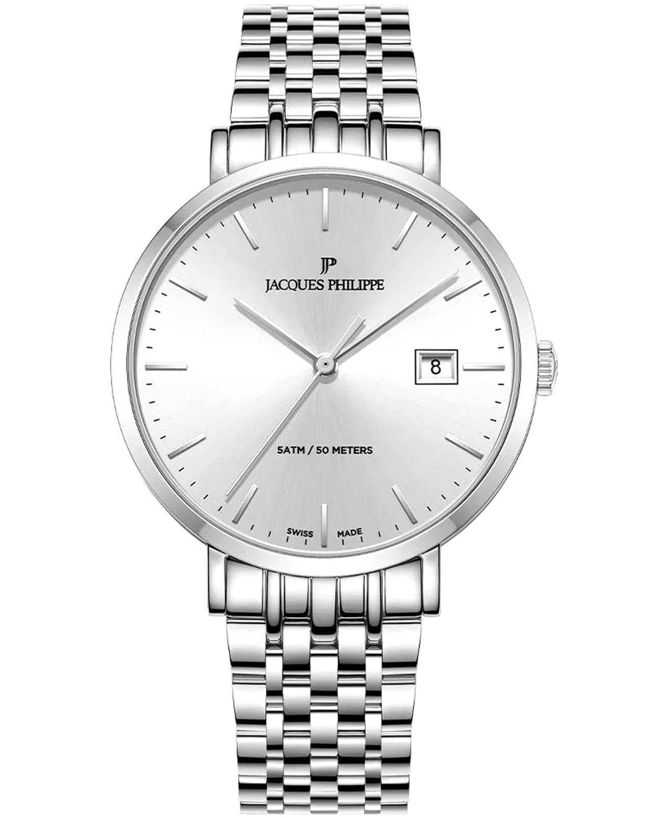 Швейцарские мужские часы Jacques Philippe Albunea JPQGS951326 кварцевый механизм с высокой точностью. Прочное сапфировое стеклоСапфировое стеклоПрочный и надёжный материал из кристалла сапфира синтетического происхождения, характеризующийся особой твёрдостью и устойчивостью к царапинам и повреждениям. устойчивое к царапинам и механическим повреждениям. Циферблат серебристого цвета украшен классическими стрелками и метками гармонично дополняющие общий дизайн модели. Элегантный корпус изготовлен из нержавеющей стали, диаметром 39 мм, что делает их устойчивыми к внешним воздействиям и придает благородный вид. Стальной браслет на застёжке-бабочке с кнопкамиЗастёжка "бабочка"Такой вид застёжки дополняется предохранителями, помогающими избежать случайного раскрытия браслета. Обладают изящным исполнением. обеспечивает комфортное и безопасное ношение. Окошко даты находится в положении 3 часа. Класс водозащиты: 50 метров позволит защитить корпус от случайных брызг или капель дождя. Эти часы станут идеальным выбором для мужчин, ценящих стиль, качество и функциональность.