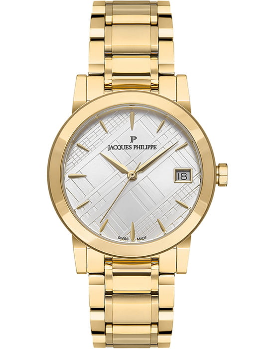 Часы Jacques Philippe JPQLS162324 — элегантные женские часы, сочетающие швейцарское качество и современный дизайн. Корпус диаметром 34 мм выполнен из нержавеющей стали с PVD-покрытиемPVDУльтратонкое покрытие наносится в технике вакуумного напыления, сочетает в себе нитрид титана особой прочности со слоем золота или оксида хрома. Несёт в себе декоративную или защитную функцию. золотого цвета, а серебристый циферблат защищён сапфировым стекломСапфировое стеклоПрочный и надёжный материал из кристалла сапфира синтетического происхождения, характеризующийся особой твёрдостью и устойчивостью к царапинам и повреждениям..