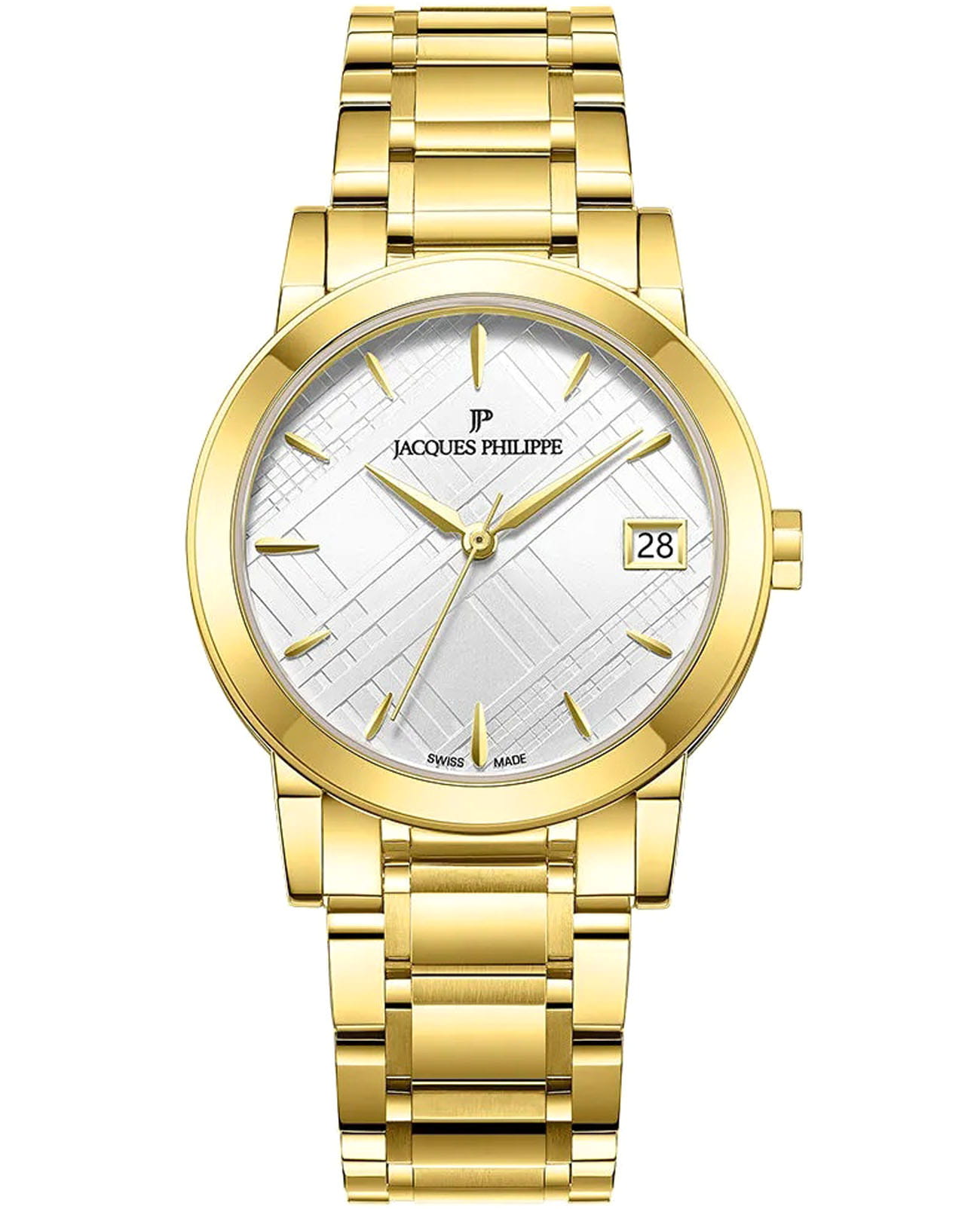 Швейцарские женские часы Jacques Philippe Cosmos mini JPQLS312324 кварцевый механизм с высокой точностью. Прочное сапфировое стеклоСапфировое стеклоПрочный и надёжный материал из кристалла сапфира синтетического происхождения, характеризующийся особой твёрдостью и устойчивостью к царапинам и повреждениям. устойчивое к царапинам и механическим повреждениям. Циферблат серебристого цвета украшен классическими стрелками и метками гармонично дополняющие общий дизайн модели. Элегантный корпус изготовлен из нержавеющей стали с IP-покрытиемIP-покрытиеМетод ионного напыления. Демонстрирует повышенную устойчивость к истиранию, окислению и химическим веществам. Под воздействием высокого давления и температуры около 1500°C молекулы металла надёжно соединяются с частицами корпуса часов. золотистого цвета, диаметром 30 мм, что делает их устойчивыми к внешним воздействиям и придает благородный вид. Стальной браслет с IP-покрытиемIP-покрытиеМетод ионного напыления. Демонстрирует повышенную устойчивость к истиранию, окислению и химическим веществам. Под воздействием высокого давления и температуры около 1500°C молекулы металла надёжно соединяются с частицами корпуса часов. на застёжке-бабочке с кнопкамиЗастёжка "бабочка"Такой вид застёжки дополняется предохранителями, помогающими избежать случайного раскрытия браслета. Обладают изящным исполнением. обеспечивает комфортное и безопасное ношение. Окошко даты находится в положении 3 часа. Класс водозащиты: 50 метров позволит защитить корпус от случайных брызг или капель дождя. Эти часы станут идеальным выбором для женщин, ценящих стиль, качество и функциональность.