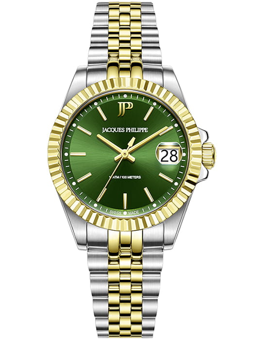 Jacques Philippe JPQLS5873X8 — женские часы в сдержанном классическом исполнении с акцентом на простоту и надёжность. Корпус диаметром 32 мм выполнен из нержавеющей стали — делает модель универсальной и комфортной в повседневной носке. Циферблат оформлен в светлом металлическом тоне с тонкими стрелками, лаконичными часовыми метками и аккуратным окошком даты в позиции «3 часа». Минималистичный стиль подчёркивает строгость и чистоту дизайна. Поверхность защищена устойчивым к царапинам сапфировым стекломСапфировое стеклоПрочный и надёжный материал из кристалла сапфира синтетического происхождения, характеризующийся особой твёрдостью и устойчивостью к царапинам и повреждениям., которое обеспечивает хорошую читаемость и долговечность. БезельБезельВнешний ободок, закрепляющий стекло. В спортивных часах так называется поворотное кольцо с делениями на циферблате, выполняет роль таймера – замеряет отрезки времени на шкале. Неподвижный безель – элемент декора. Однонаправленно вращающийся безель на дайверских часах позволяет фиксировать моменты погружения и выныривания на поверхность. с PVD-покрытиемPVDУльтратонкое покрытие наносится в технике вакуумного напыления, сочетает в себе нитрид титана особой прочности со слоем золота или оксида хрома. Несёт в себе декоративную или защитную функцию.. Механизм — точный швейцарский кварц, не требующий подзавода. Он обеспечивает стабильную и бесперебойную работу часов, сохраняя точность в любых условиях. Браслет из нержавеющей стали с PVD-покрытиемPVDУльтратонкое покрытие наносится в технике вакуумного напыления, сочетает в себе нитрид титана особой прочности со слоем золота или оксида хрома. Несёт в себе декоративную или защитную функцию. визуально продолжает корпус и фиксируется с помощью надёжной застёжки, обеспечивая комфортную посадку. Водозащита до 10 ATM позволяет использовать часы не только в повседневной жизни, но и при активности на воде. Jacques Philippe — это надёжная и универсальная модель для тех, кто ценит швейцарскую точность, простоту и уверенный стиль без лишних деталей.