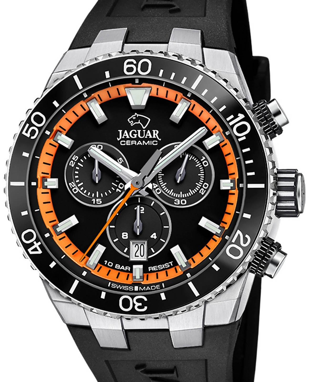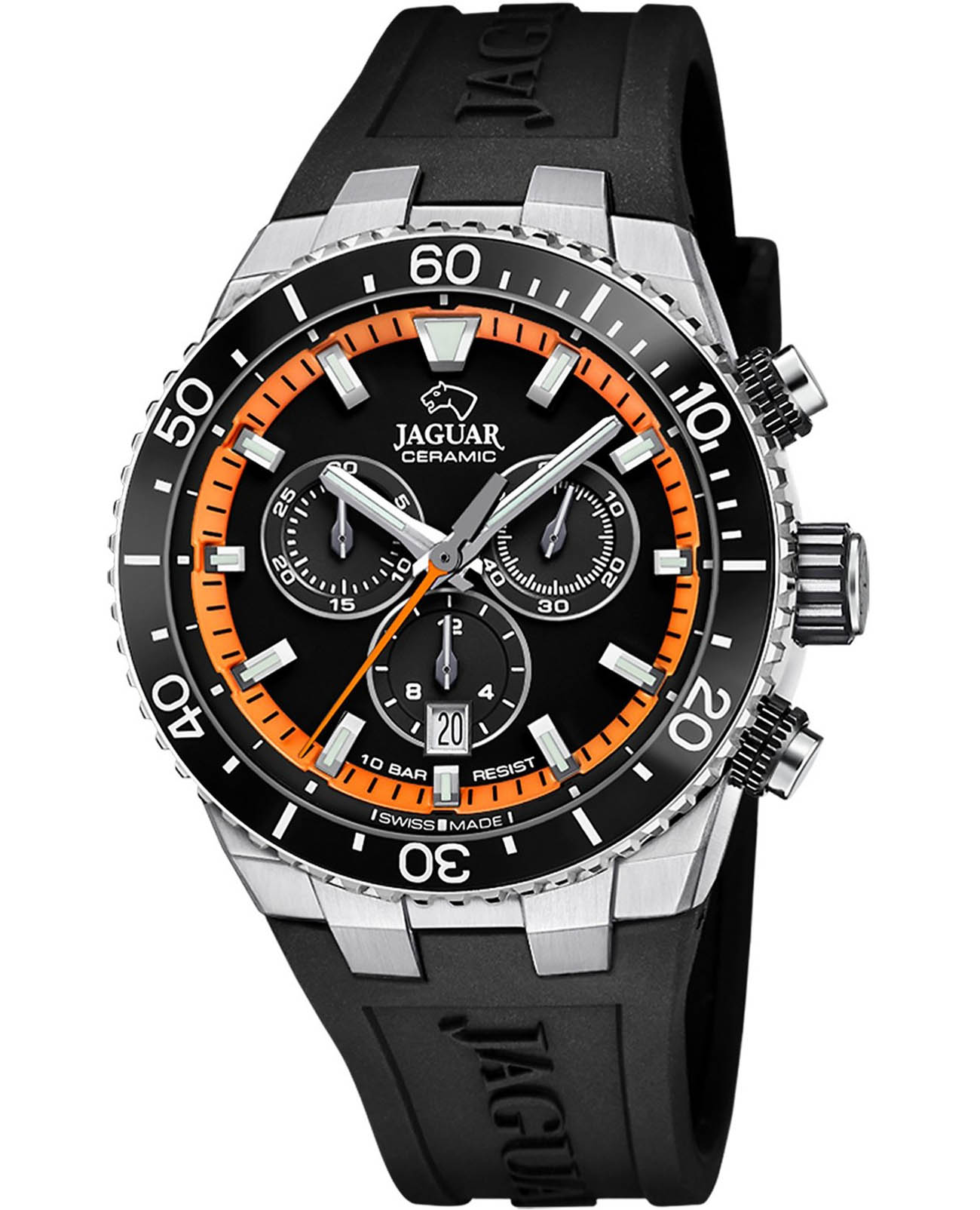 Мужские швейцарские часы-хронографХронографФункция позволяет измерять отрезки времени с особой точностью: часы, минуты, секунды. Верным признаком хронографа является наличие на циферблате 3 дополнительных окошек-счётчиков. Jaguar Ceramic J1021/4. Кварцевый швейцарский калибр Ronda 5030d. Сапфировое стеклоСапфировое стеклоПрочный и надёжный материал из кристалла сапфира синтетического происхождения, характеризующийся особой твёрдостью и устойчивостью к царапинам и повреждениям. устойчивое к мелким механическим повреждениям. Корпус часов изготовлен из нержавеющей стали. Стрелки и метки с люминесцентным покрытиемЛюминесцентное покрытиеПозволяет считывать показания времени в темноте. Производители наносят на стрелки, часовые индексы, безель или поверхность циферблата светонакопительный состав, дающий холодное свечение.. Окошко даты находится в положении 6 часов. Класс водозащиты: 100 метров, позволит плавать, нырять и заниматься другими водными видами спорта. Силиконовый ремешок на стандартной застёжке. БезельБезельВнешний ободок, закрепляющий стекло. В спортивных часах так называется поворотное кольцо с делениями на циферблате, выполняет роль таймера – замеряет отрезки времени на шкале. Неподвижный безель – элемент декора. Однонаправленно вращающийся безель на дайверских часах позволяет фиксировать моменты погружения и выныривания на поверхность. из высокотехнологичной керамикиВысокотехнологичная керамикаИнновационный запатентованный Rado материал с гладкой или матовой поверхностью. Керамика за счёт кристаллической структуры обладает повышенной устойчивостью от возникновения царапин. Материал способен принимать температуру тела человека, обеспечивая невероятный комфорт при ношении..