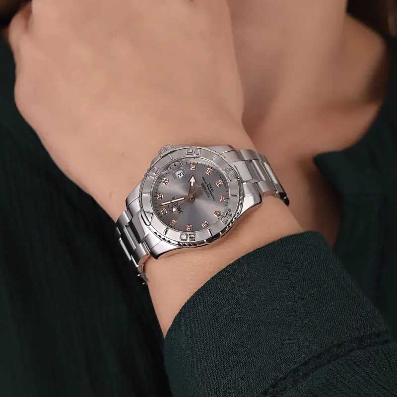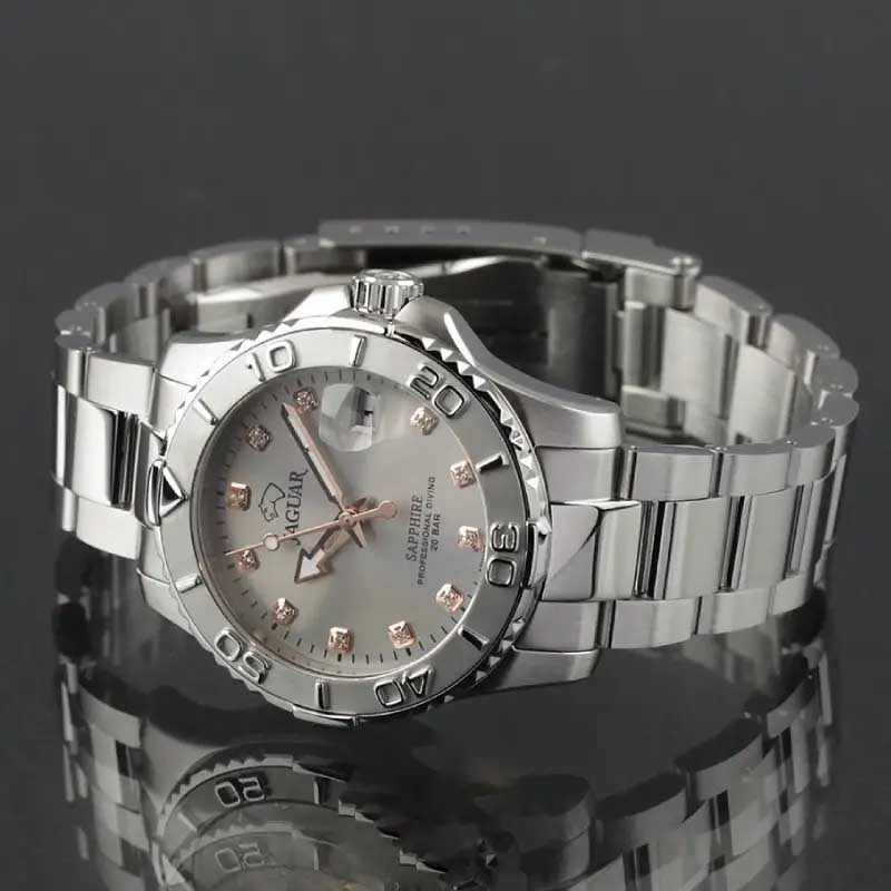 Женские швейцарские часы Jaguar Couple Diver J870/2. Кварцевый швейцарский калибр Ronda 705. Сапфировое стеклоСапфировое стеклоПрочный и надёжный материал из кристалла сапфира синтетического происхождения, характеризующийся особой твёрдостью и устойчивостью к царапинам и повреждениям. устойчивое к мелким механическим повреждениям. Корпус и браслет часов изготовлены из нержавеющей стали. Стрелки с люминесцентным покрытиемЛюминесцентное покрытиеПозволяет считывать показания времени в темноте. Производители наносят на стрелки, часовые индексы, безель или поверхность циферблата светонакопительный состав, дающий холодное свечение.. Окошко даты находится в положении 3 часа. Класс водозащиты: 200 метров, позволит плавать, нырять и заниматься другими водными видами спорта. Стальной браслет на раскладной застёжкеРаскладная застёжкаТакой тип застёжки используется только на браслетах из металла. Она никогда не раскрывается полностью, происходит разделение на 2 и более частей. Раскладывающая застёжка снизит вероятность потери часов к минимуму.. Циферблат украшен 11 кристаллами в роли часовых индексов.