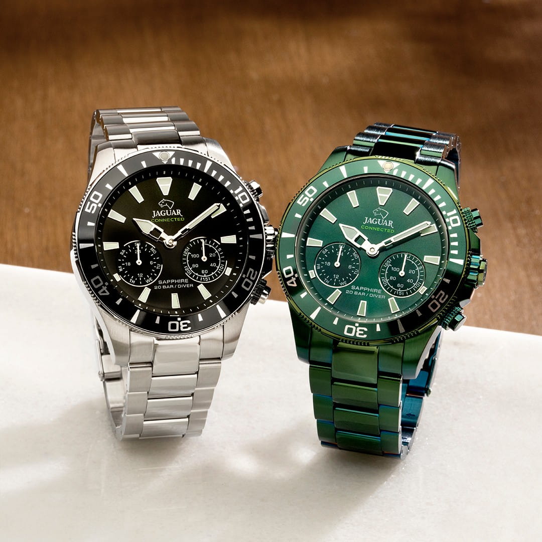 Мужские швейцарские часы Jaguar Connected J990/1. Сапфировое стеклоСапфировое стеклоПрочный и надёжный материал из кристалла сапфира синтетического происхождения, характеризующийся особой твёрдостью и устойчивостью к царапинам и повреждениям. устойчивое к мелким механическим повреждениям. Корпус часов изготовлен из нержавеющей стали с PVD-покрытиемPVDУльтратонкое покрытие наносится в технике вакуумного напыления, сочетает в себе нитрид титана особой прочности со слоем золота или оксида хрома. Несёт в себе декоративную или защитную функцию.. Стрелки и метки с люминесцентным покрытиемЛюминесцентное покрытиеПозволяет считывать показания времени в темноте. Производители наносят на стрелки, часовые индексы, безель или поверхность циферблата светонакопительный состав, дающий холодное свечение.. Календарь находится в положении 8 часов. Класс водозащиты: 200 метров, позволит плавать, нырять и заниматься другими водными видами спорта. Стальной браслет с PVD-покрытиемPVDУльтратонкое покрытие наносится в технике вакуумного напыления, сочетает в себе нитрид титана особой прочности со слоем золота или оксида хрома. Несёт в себе декоративную или защитную функцию. на раскладной застёжкеРаскладная застёжкаТакой тип застёжки используется только на браслетах из металла. Она никогда не раскрывается полностью, происходит разделение на 2 и более частей. Раскладывающая застёжка снизит вероятность потери часов к минимуму.. БезельБезельВнешний ободок, закрепляющий стекло. В спортивных часах так называется поворотное кольцо с делениями на циферблате, выполняет роль таймера – замеряет отрезки времени на шкале. Неподвижный безель – элемент декора. Однонаправленно вращающийся безель на дайверских часах позволяет фиксировать моменты погружения и выныривания на поверхность. с PVD-покрытиемPVDУльтратонкое покрытие наносится в технике вакуумного напыления, сочетает в себе нитрид титана особой прочности со слоем золота или оксида хрома. Несёт в себе декоративную или защитную функцию.. За точный ход работы часов, из коллекции Connected, отвечает кварцевый гибридный механизм швейцарского производства со Смарт-Модулем. Данный тип механизма обеспечивает возможность подключить часы к телефону через Bluetooth и управлять большим рядом дополнительных функций на выбор с помошью приложения Jaguar. Дополнительные функции: отображение даты и дня недели, секундомер, таймер, GMT, шагомер, поиск телефона, включение/выключение звука телефона при входящих вызовах, переключение музыки, вибро-уведомления.