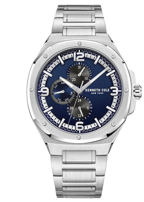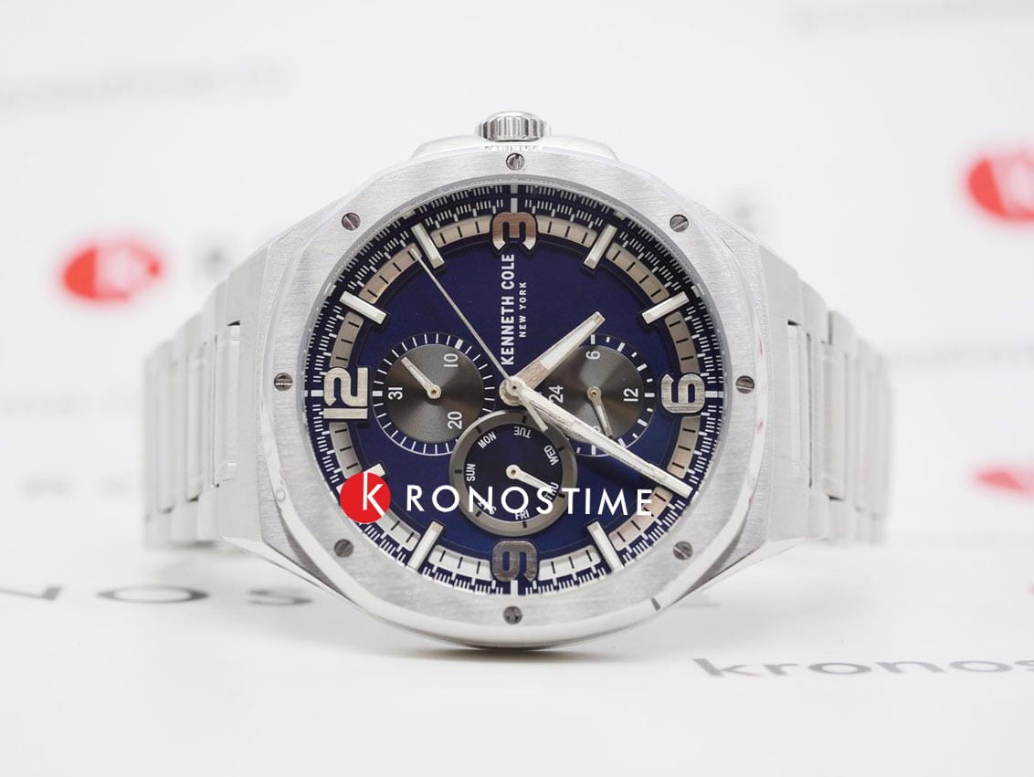 Мужские кварцевые часы-хронографХронографФункция позволяет измерять отрезки времени с особой точностью: часы, минуты, секунды. Верным признаком хронографа является наличие на циферблате 3 дополнительных окошек-счётчиков. с секундомеромСекундомерСекундоме́р — прибор, способный измерять интервалы времени с точностью до долей секунды. Kenneth Cole Dress Sport KCWGK2218704, кварцевый механизм с высокой точностью. Минеральное стеклоМинеральное стеклоМинеральное стекло представляет собой искусственно выращенный минерал кварца. Такое стекло отличается особой устойчивостью к повреждениям и царапинам. Уступает по некоторым качествам сапфировому стеклу. устойчивое к появлению царапин, обладающее высокой прозрачностью. Класс водозащиты: 30 метров, позволит защитить корпус от случайных брызг или капель дождя. Корпус и безельБезельВнешний ободок, закрепляющий стекло. В спортивных часах так называется поворотное кольцо с делениями на циферблате, выполняет роль таймера – замеряет отрезки времени на шкале. Неподвижный безель – элемент декора. Однонаправленно вращающийся безель на дайверских часах позволяет фиксировать моменты погружения и выныривания на поверхность. изготовлен из нержавеющей стали. Индикация даты и дня недели. Стрелки и метки с люминесцентным покрытиемЛюминесцентное покрытиеПозволяет считывать показания времени в темноте. Производители наносят на стрелки, часовые индексы, безель или поверхность циферблата светонакопительный состав, дающий холодное свечение.. Браслет  из стали с раскладной застёжкойРаскладная застёжкаТакой тип застёжки используется только на браслетах из металла. Она никогда не раскрывается полностью, происходит разделение на 2 и более частей. Раскладывающая застёжка снизит вероятность потери часов к минимуму..