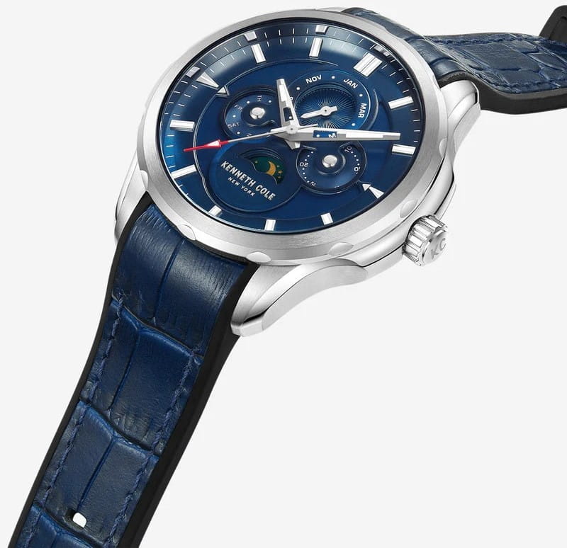 Мужские кварцевые часы с минеральным стекломМинеральное стеклоМинеральное стекло представляет собой искусственно выращенный минерал кварца. Такое стекло отличается особой устойчивостью к повреждениям и царапинам. Уступает по некоторым качествам сапфировому стеклу. Kenneth Cole New York KCWGQ0015806, кварцевый механизм с высокой точностью. Класс водозащиты: 30 метров, позволит защитить корпус от случайных брызг или капель дождя. Корпус часов изготовлен из стали. Кожаный ремешок на стандартной застёжке. Стрелки и метки с люминесцентным покрытиемЛюминесцентное покрытиеПозволяет считывать показания времени в темноте. Производители наносят на стрелки, часовые индексы, безель или поверхность циферблата светонакопительный состав, дающий холодное свечение..