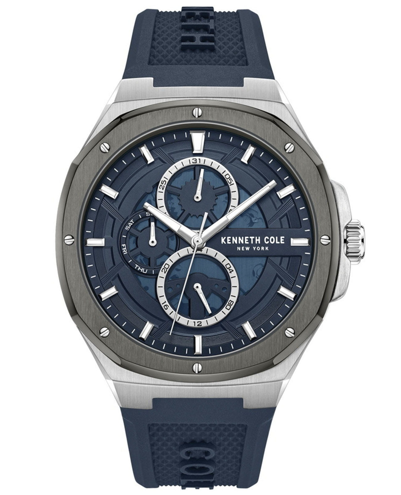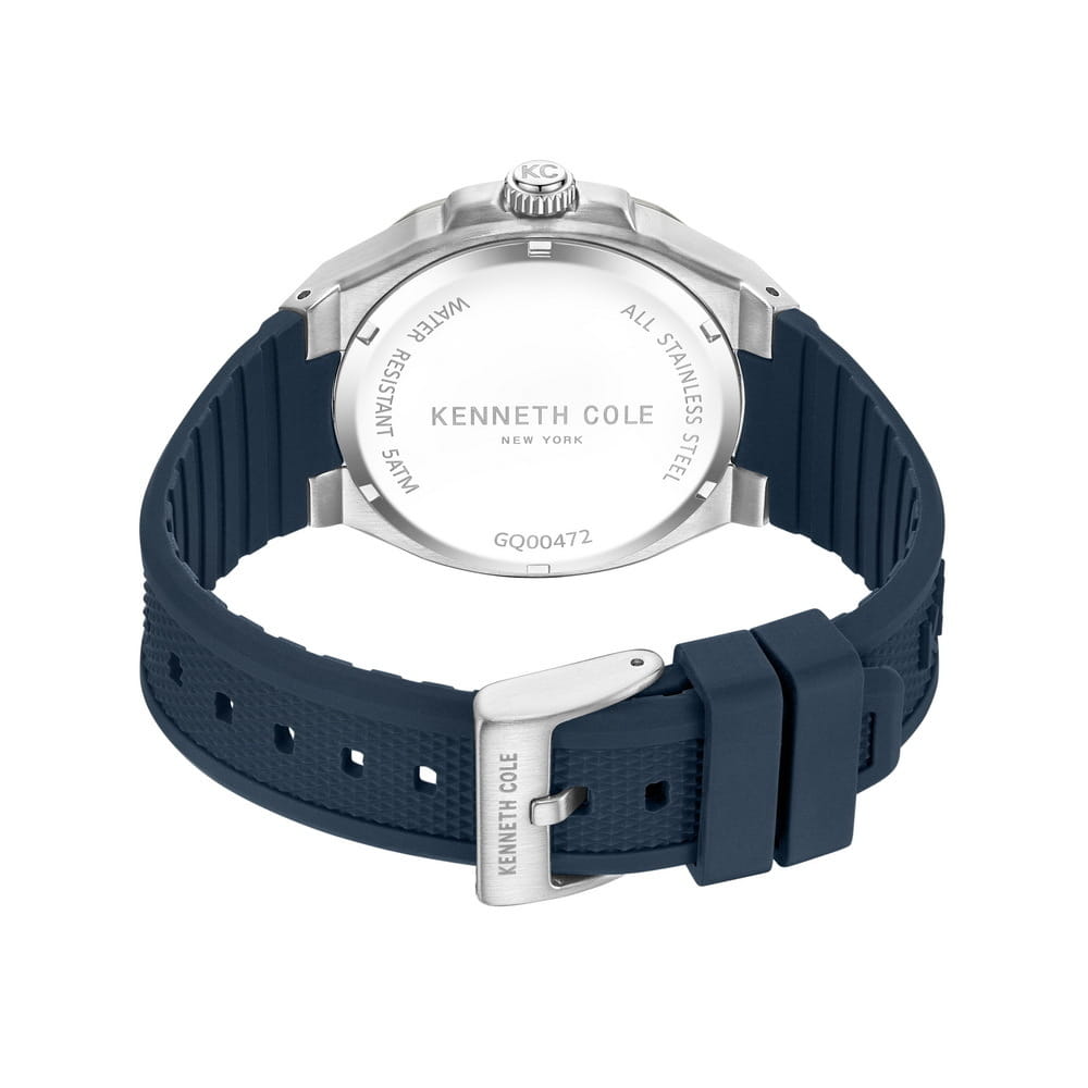 Мужские кварцевые часы Kenneth Cole KCWGQ0047201 — это стильный и функциональный аксессуар с современным дизайном. Корпус диаметром 43 мм выполнен из нержавеющей стали. Безель с IP-покрытиемIP-покрытиеМетод ионного напыления. Демонстрирует повышенную устойчивость к истиранию, окислению и химическим веществам. Под воздействием высокого давления и температуры около 1500°C молекулы металла надёжно соединяются с частицами корпуса часов. в серо-чёрных тонах. Циферблат синего цвета оформлен метками в виде штрихов. Стрелки и метки оснащены люминесцентным покрытиемЛюминесцентное покрытиеПозволяет считывать показания времени в темноте. Производители наносят на стрелки, часовые индексы, безель или поверхность циферблата светонакопительный состав, дающий холодное свечение., обеспечивающим хорошую читаемость в темноте. Циферблат защищён минеральным стекломМинеральное стеклоМинеральное стекло представляет собой искусственно выращенный минерал кварца. Такое стекло отличается особой устойчивостью к повреждениям и царапинам. Уступает по некоторым качествам сапфировому стеклу.. Часы оснащены силиконовым ремешком синего цвета с классической пряжкой. Водонепроницаемость 50 м позволяет использовать часы для плавания и повседневного ношения. Универсальный выбор для тех, кто ценит выразительный дизайн и надёжность.