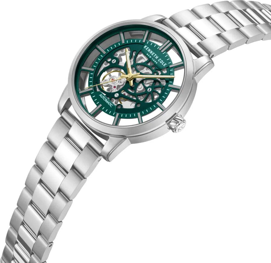 Мужские механические часы с автоподзаводом Kenneth Cole — это стильный аксессуар с эффектом скелетон. Корпус диаметром 44,5 мм выполнен из стали. Циферблат зелёного цвета оформлен штрихами и стрелками, а также частично открытой структурой механизма, позволяющей наблюдать за работой внутренних деталей. Циферблат защищён минеральным стекломМинеральное стеклоМинеральное стекло представляет собой искусственно выращенный минерал кварца. Такое стекло отличается особой устойчивостью к повреждениям и царапинам. Уступает по некоторым качествам сапфировому стеклу.. Гранёная заводная головка дополняет классический дизайн. Прозрачная задняя крышка открывает вид на механизм. Часы оснащены стальным браслетом с раскладной застёжкойРаскладная застёжкаТакой тип застёжки используется только на браслетах из металла. Она никогда не раскрывается полностью, происходит разделение на 2 и более частей. Раскладывающая застёжка снизит вероятность потери часов к минимуму.. Водонепроницаемость 30 м позволяет использовать часы в повседневных условиях. Идеальный выбор для тех, кто ценит технологии и современный стиль.