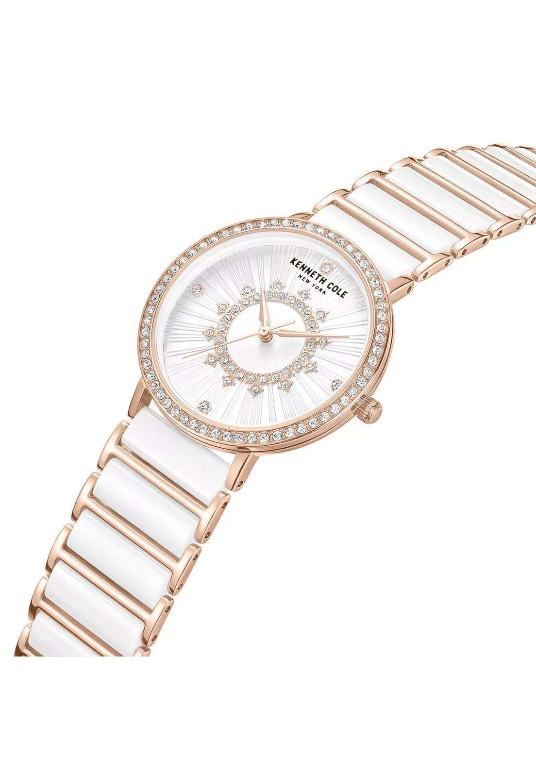 Женские кварцевые часы Kenneth Cole — это элегантный и выразительный аксессуар. Корпус диаметром 36 мм выполнен из нержавеющей стали 316L с IP-покрытиемIP-покрытиеМетод ионного напыления. Демонстрирует повышенную устойчивость к истиранию, окислению и химическим веществам. Под воздействием высокого давления и температуры около 1500°C молекулы металла надёжно соединяются с частицами корпуса часов. цвета розового золота. Циферблат белого цвета оформлен индексами и украшен цирконами. Циферблат защищён минеральным стекломМинеральное стеклоМинеральное стекло представляет собой искусственно выращенный минерал кварца. Такое стекло отличается особой устойчивостью к повреждениям и царапинам. Уступает по некоторым качествам сапфировому стеклу.. Часы оснащены браслетом из нержавеющей стали с IP-покрытиемIP-покрытиеМетод ионного напыления. Демонстрирует повышенную устойчивость к истиранию, окислению и химическим веществам. Под воздействием высокого давления и температуры около 1500°C молекулы металла надёжно соединяются с частицами корпуса часов. и вставками из высокотехнологичной керамикиВысокотехнологичная керамикаИнновационный запатентованный Rado материал с гладкой или матовой поверхностью. Керамика за счёт кристаллической структуры обладает повышенной устойчивостью от возникновения царапин. Материал способен принимать температуру тела человека, обеспечивая невероятный комфорт при ношении. на раскладной застёжкеРаскладная застёжкаТакой тип застёжки используется только на браслетах из металла. Она никогда не раскрывается полностью, происходит разделение на 2 и более частей. Раскладывающая застёжка снизит вероятность потери часов к минимуму.. Водонепроницаемость 30 м позволяет использовать часы в повседневных условиях. Идеальный выбор для тех, кто ценит стиль, блеск и американское качество.