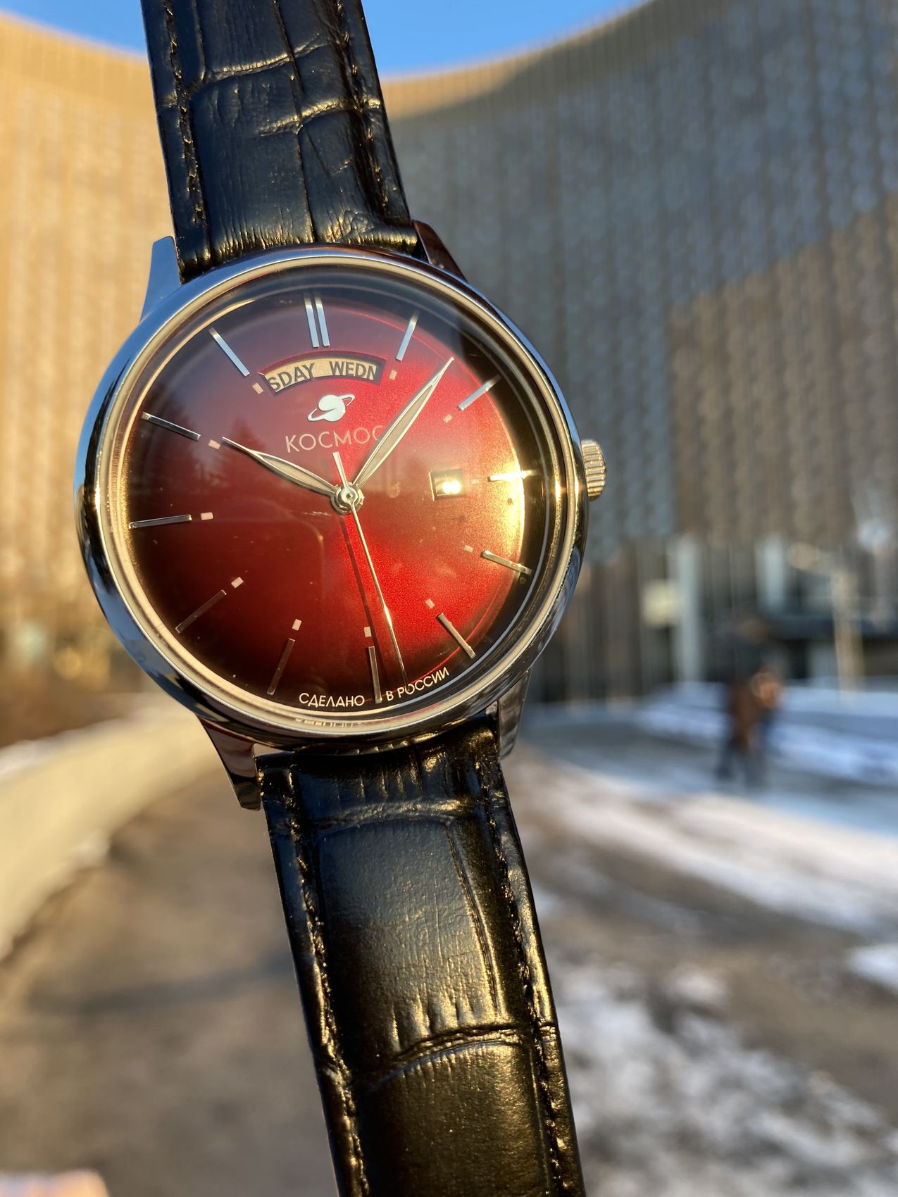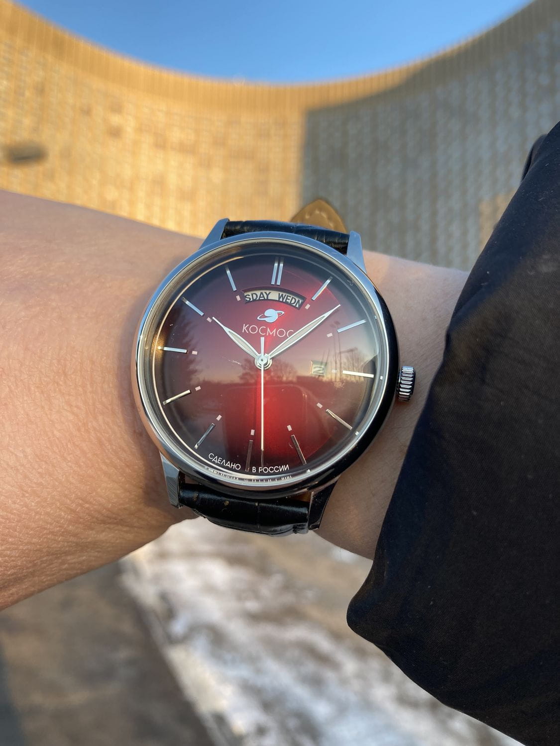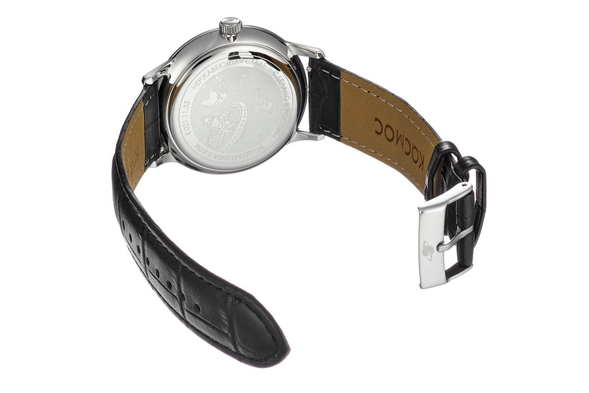 Мужские наручные часы Космос Орион K 011.11.35 — это сочетание традиций часового искусства 60-70-х годов и футуристического дизайна, вдохновленного космическими исследованиями. Они не только служат напоминанием о прошлом, но и побуждают задуматься о будущем, позволяя наслаждаться качеством и смыслом, вложенными в каждую деталь. Полированный корпус часов выполнен в виде силуэта летающей тарелки благодаря выпуклым формам стекла и нижней части корпуса. Стальные ушки, которые напоминают опоры летающей тарелки, завершает общий образ. На задней крышке часов выгравирован фантазийный сюжет – космическая станция будущего. Бордовый циферблат, выполненный в ретро-стиле, имеет выгнутые края, что требует использования сложной технологии производства. Такой дизайн был характерен для часов прошлых эпох. Секундная стрелка, имеющая изогнутую форму, идеально соответствует контуру циферблата. Выпуклый градиентный циферблат с шлифовкой, напоминающей солнечные лучи, украшен вручную изготовленными индексами, которые надежно крепятся на двух штифтах. Часовая и минутная стрелки, а также линия по краю циферблата, напоминающая ореол Земли, имеют люминесцентное покрытиеЛюминесцентное покрытиеПозволяет считывать показания времени в темноте. Производители наносят на стрелки, часовые индексы, безель или поверхность циферблата светонакопительный состав, дающий холодное свечение., которое светится в темноте, создавая впечатляющий визуальный эффект. В верхней части циферблата расположено окошко для отображения дня недели на английском языке, а индикаторы даты и дня недели дополнительно украшены фасочками, что придает им элегантный вид. Форма минерального стеклаМинеральное стеклоМинеральное стекло представляет собой искусственно выращенный минерал кварца. Такое стекло отличается особой устойчивостью к повреждениям и царапинам. Уступает по некоторым качествам сапфировому стеклу. также тщательно продумана, оно изогнуто как снаружи, так и изнутри. Это позволяет избежать искажений изображения на циферблате, в отличие от традиционного стекла с прямой внутренней частью, создающего эффект линзы. Ремешок из натуральной кожи черного цвета прекрасно дополняет часы. Также имеется возможность приобрести дополнительные ремни и браслеты миланского плетения, которые можно легко менять благодаря специальным крепежам. Заводная головка, застежка и ремешок украшены фирменным логотипом, подчеркивающим индивидуальность и стиль модели.