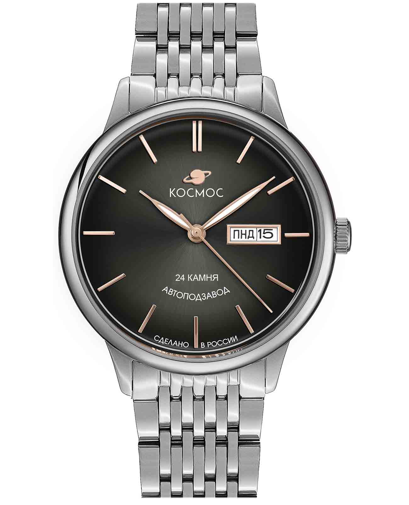 Российские мужские механические часы Космос K 043.19.35 из коллекции Юпитер оснащены механизмом TMI с автоподзаводом. Круглый корпус из нержавеющей стали диаметром 41 мм защищен минеральным стекломМинеральное стеклоМинеральное стекло представляет собой искусственно выращенный минерал кварца. Такое стекло отличается особой устойчивостью к повреждениям и царапинам. Уступает по некоторым качествам сапфировому стеклу.. Циферблат дополнен функциями отображения даты и дня недели. Часы имеют водонепроницаемость 50 метров, позволит защитить корпус от случайных брызг или капель дождя. Модель комплектуется стальным браслетом на застёжке-бабочке с кнопкамиЗастёжка "бабочка"Такой вид застёжки дополняется предохранителями, помогающими избежать случайного раскрытия браслета. Обладают изящным исполнением. . Прочный корпус и надежный механизм делают эти часы универсальным аксессуаром для повседневного использования. Уникальный дизайн и высокое качество материалов подчеркивают индивидуальность владельца.