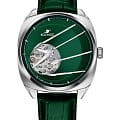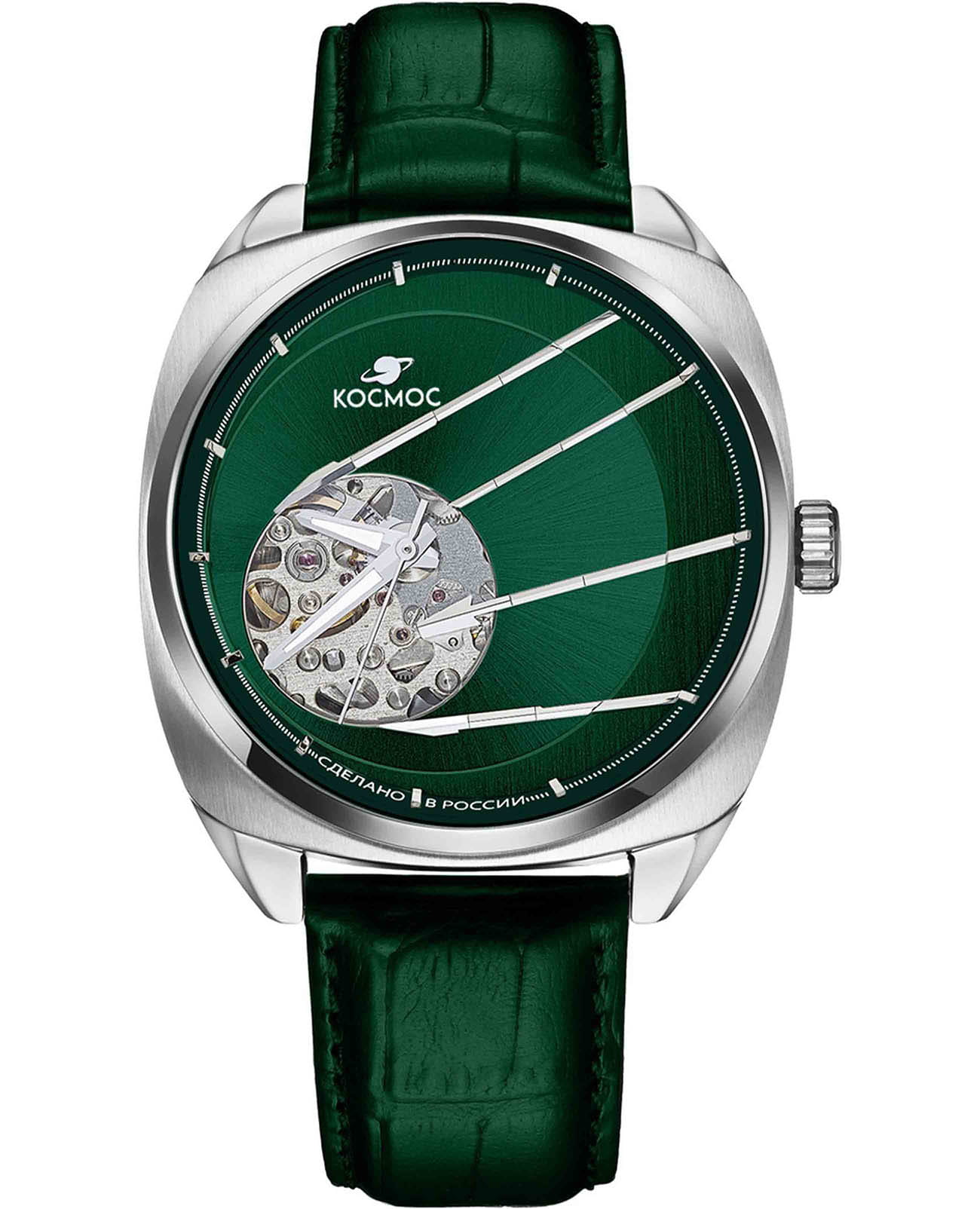 Мужские наручные часы Космос Спутник K 115.17.37 — это уникальная лимитированная серия, созданная в честь исторического запуска первого искусственного спутника Земли. В корпусе необычной круглой формы, выполненном из гипоаллергенной нержавеющей стали, работает надежный механический механизм с автоподзаводом от японской компании Seiko. Прозрачная задняя крышка, закрепленная на четырех винтах, открывает вид на сложный механизм, а на самой крышке указан индивидуальный номер модели в формате хх/50. Скелетонизированный зеленый циферблат защищен сапфировым стекломСапфировое стеклоПрочный и надёжный материал из кристалла сапфира синтетического происхождения, характеризующийся особой твёрдостью и устойчивостью к царапинам и повреждениям. с антибликовым покрытиемАнтибликовое покрытиеСлой оксида металла в 0,13-0,3 микрон, благодаря которому стекло часов не бликует и не отражает свет. Антибликовое покрытие уменьшает отражение света в 10 раз, обеспечивая отличную читаемость показателей циферблата., которое обеспечивает максимальную устойчивость к царапинам и идеальную видимость в любых условиях. Украшением циферблата служат крупные стрелки с люминесцентным покрытиемЛюминесцентное покрытиеПозволяет считывать показания времени в темноте. Производители наносят на стрелки, часовые индексы, безель или поверхность циферблата светонакопительный состав, дающий холодное свечение., а также специальная апертура, окаймленная элементами, напоминающими антенны Спутника. Часовая и минутная стрелки отлично читаются благодаря своему размеру и светящемуся покрытию. Браслет из натуральной кожи зеленого цвета дополнен удобной застежкой-бабочкой с двумя боковыми кнопкамиЗастёжка "бабочка"Такой вид застёжки дополняется предохранителями, помогающими избежать случайного раскрытия браслета. Обладают изящным исполнением. , что гарантирует надежную фиксацию на руке. Водозащита до 10 атм (WR100) позволяет использовать часы при плавании и других водных видах спорта без акваланга. Коллекция Спутник — это выбор для ценителей истории космических достижений и современных технологий.