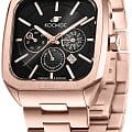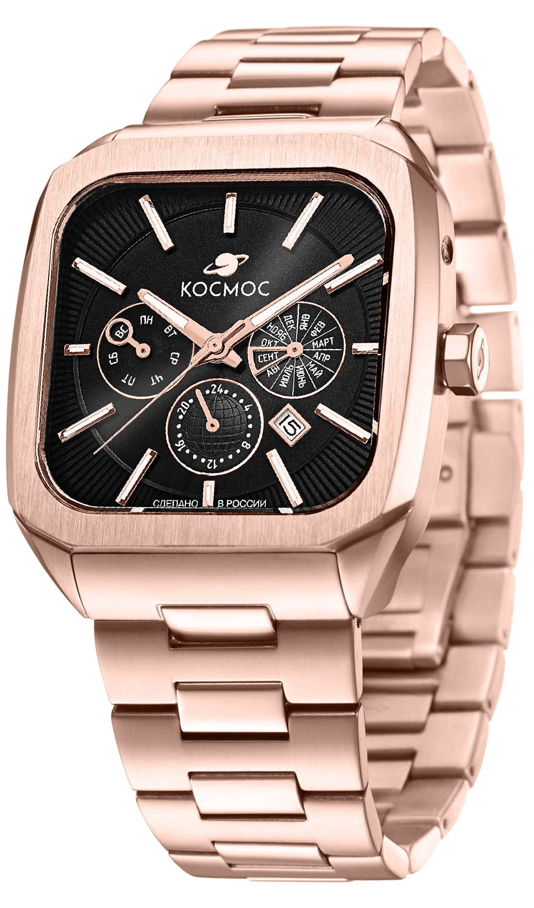 Мужские наручные часы Космос Марсоход II K 219.40.31 — это уникальная лимитированная серия, посвященная аппарату, способному передвигаться по поверхности Красной планеты. Марсоход ассоциируется с брутальностью, мастерством и технической сложностью. Наша страна дважды запускала подобные аппараты еще в 70-х годах прошлого века. Дизайн часов серии Марсоход вдохновлен лучшими работами советских мастеров, сочетая современные технологии часового искусства с обаянием стиля ретро. Корпус в форме квадрата с закругленными углами выполнен из нержавеющей стали с PVDPVDУльтратонкое покрытие наносится в технике вакуумного напыления, сочетает в себе нитрид титана особой прочности со слоем золота или оксида хрома. Несёт в себе декоративную или защитную функцию. покрытием украшен зеркальной полировкой и сатинированием. Удобная заводная головка имеет форму гайки, что добавляет модели индустриальный шарм. Задняя крышка прозрачная, закрепленная на четырех винтах, и позволяет увидеть работу механизма TMI с подвижным ротором, на котором гравируется надпись «Сделано в России». Также здесь представлена гравировка с изображением космонавта, придающая часам особую значимость. Водостойкость достигает 10 атм (WR100), что позволяет использовать часы при плавании и других водных видах спорта. На задней крышке указан индивидуальный номер модели в формате от 01/50 до 50/50. Объемный циферблат состоит из двух уровней. В центре движутся три стрелки, часовая и минутная из которых имеют люминесцентное покрытиеЛюминесцентное покрытиеПозволяет считывать показания времени в темноте. Производители наносят на стрелки, часовые индексы, безель или поверхность циферблата светонакопительный состав, дающий холодное свечение., позволяющее определять время даже в темноте. Также, здесь расположили три дополнительных индикатора: день недели, месяц и время в формате 24-х часов. Для обозначения дня недели и месяца используется кириллица. Окошко даты между 4 и 5 часами выделено накладной рамкой. Циферблат защищен прочным сапфировым стеклом с антибликовым покрытиемСапфировое стеклоПрочный и надёжный материал из кристалла сапфира синтетического происхождения, характеризующийся особой твёрдостью и устойчивостью к царапинам и повреждениям., обеспечивающим отличную читаемость показаний в любых условиях. Второй уровень декорирован гильоше в виде солнечных лучей, на нем закреплены накладные индексы. Браслет изготовлен из литых стальных звеньев нержавеющей стали и оснащен удобной застёжкой «бабочка» с кнопкамиЗастёжка "бабочка"Такой вид застёжки дополняется предохранителями, помогающими избежать случайного раскрытия браслета. Обладают изящным исполнением. , которая сводит к минимуму вероятность потери. Заводная головка, застежка и браслет украшены фирменным логотипом бренда. Коллекция Марсоход — идеальный выбор для ценителей истории космических достижений и современных технологий.