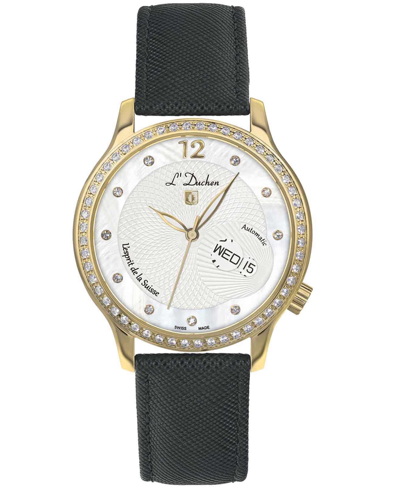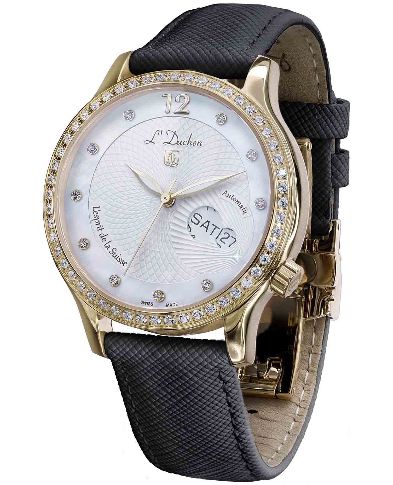 Женские швейцарские механические часы с автоподзаводом L'Duchen Coquille D 713.21.33. Сапфировое стеклоСапфировое стеклоПрочный и надёжный материал из кристалла сапфира синтетического происхождения, характеризующийся особой твёрдостью и устойчивостью к царапинам и повреждениям. устойчивое к появлению царапин, обладающее высокой прозрачностью. Корпус часов выполнен из нержавеющей стали с PVD-покрытиемPVDУльтратонкое покрытие наносится в технике вакуумного напыления, сочетает в себе нитрид титана особой прочности со слоем золота или оксида хрома. Несёт в себе декоративную или защитную функцию.. БезельБезельВнешний ободок, закрепляющий стекло. В спортивных часах так называется поворотное кольцо с делениями на циферблате, выполняет роль таймера – замеряет отрезки времени на шкале. Неподвижный безель – элемент декора. Однонаправленно вращающийся безель на дайверских часах позволяет фиксировать моменты погружения и выныривания на поверхность. и циферблат украшены фианитами. Стрелки с люминесцентным покрытиемЛюминесцентное покрытиеПозволяет считывать показания времени в темноте. Производители наносят на стрелки, часовые индексы, безель или поверхность циферблата светонакопительный состав, дающий холодное свечение.. Класс водозащиты: 50 метров, позволит защитить корпус от случайных брызг или капель дождя. Кожаный ремешок на застёжке «бабочка» с кнопкамиЗастёжка "бабочка"Такой вид застёжки дополняется предохранителями, помогающими избежать случайного раскрытия браслета. Обладают изящным исполнением. .